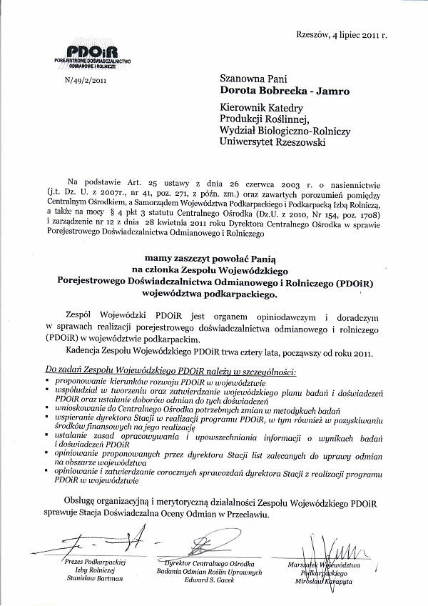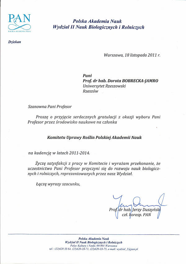 Powołanie prof. dr hab. inż. Dorota Bobrecka-Jamro do Komitetu Uprawy Roślin Polskiej Akademii Nauk