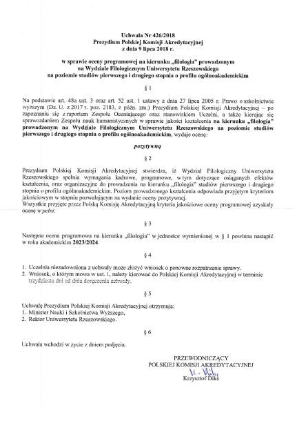 Wydział Filologiczny po dokonanej przez Polską Komisję Akredytacyjną wizytacji otrzymał pozytywną ocenę dla kierunku filologia – w specjalnościach: filologia angielska, filologia germańska i filologia rosyjska na studiach I i II stopnia o profilu ogólnoakademickim.