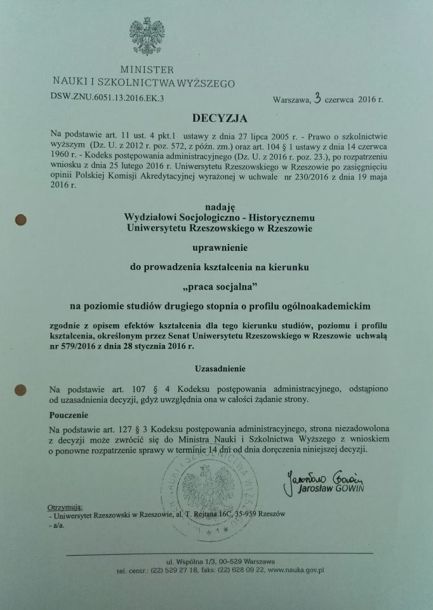 Decyzją Ministra Nauki i Szkolnictwa Wyższego, Pana Jarosława Gowina Wydział Socjologiczno-Historyczny Uniwersytetu Rzeszowskiego otrzymał uprawnienia do prowadzenia kształcenia na kierunku „praca socjalna” na poziomie studiów II stopnia o profilu ogólnoakademickim.