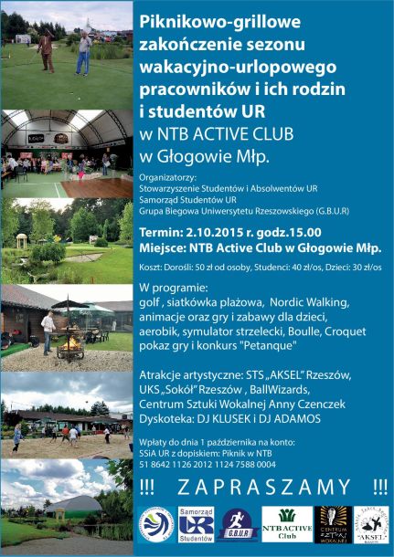 Organizatorzy imprezy pn. "Piknikowo-grillowe zakończenie sezonu wakacyjno-urlopowego pracowników UR i ich rodzin i sudentów w NTB Active Club" uprzejmie informują Państwa, że względu na aurę i złe prognozy pogody na weekend zmuszeni jesteśmy przenieść nasze Spotkanie na 2 października / piątek / br.