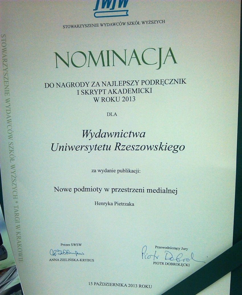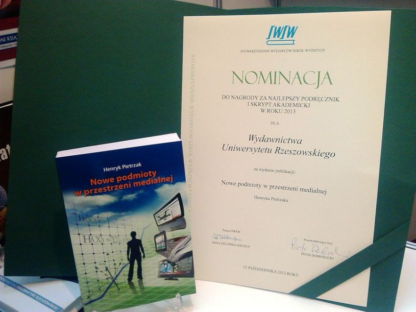 Miło nam poinformować, że wśród nominowanych przez Stowarzyszenie do nagrody książek wyróżniono jeden tytuł z Podkarpacia, przedstawiony do konkursu przez Wydawnictwo Uniwersytetu Rzeszowskiego - Nowe podmioty w przestrzeni medialnej, książkę autorstwa dra Henryka Pietrzaka.