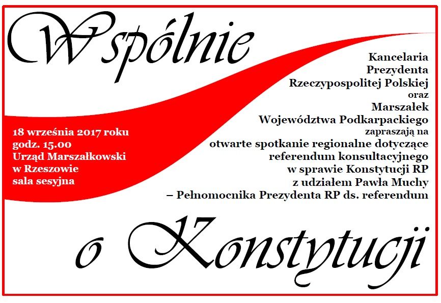 Kancelaria Prezydenta Rzeczypospolitej Polskiej wraz z Marszałkiem Województwa Podkarpackiego zaprasza na otwarte spotkanie regionalne dotyczące referendum konsultacyjnego w sprawie Konstytucji RP.