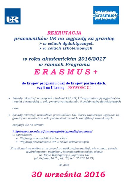 REKRUTACJA pracowników UR na wyjazdy za granicę w celach dydaktycznych lub w celach szkoleniowych w roku akademickim 2016/2017 w ramach Programu E R A S M U S +