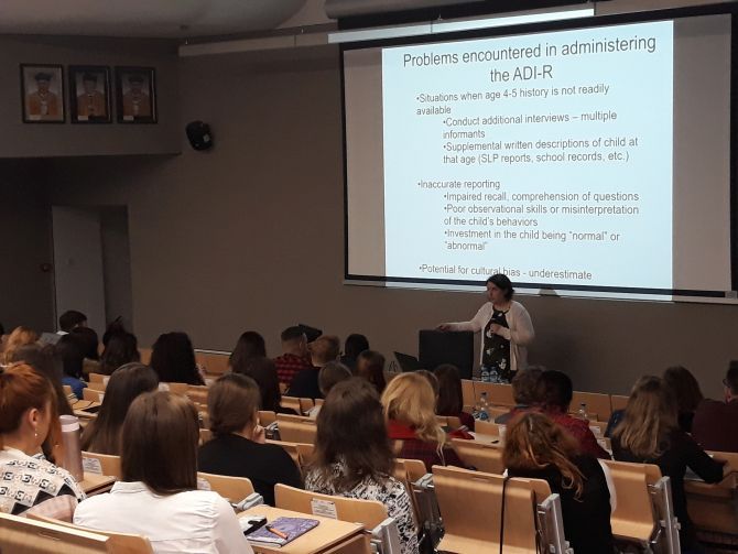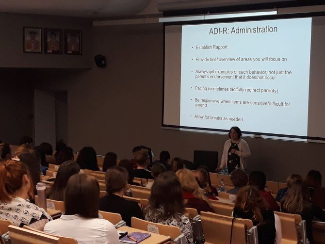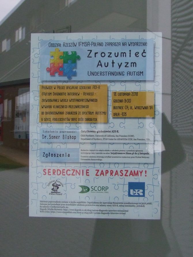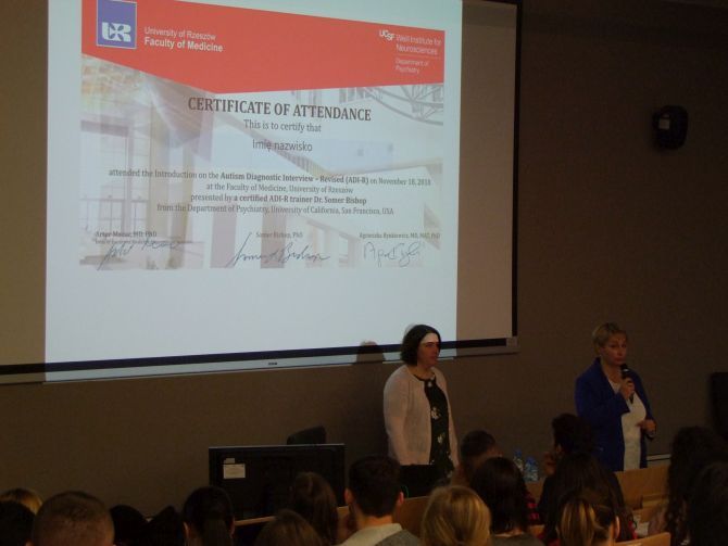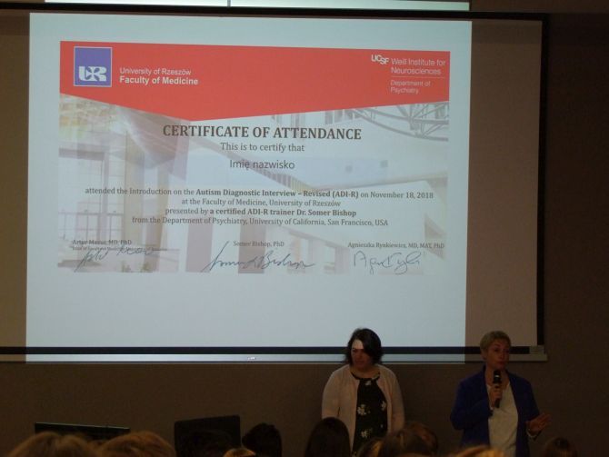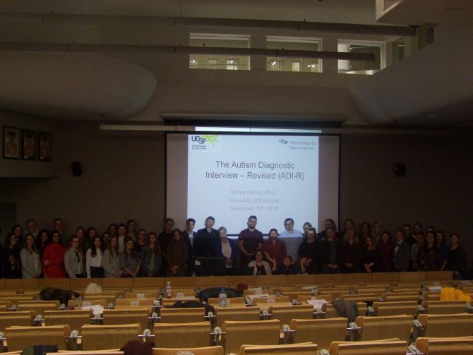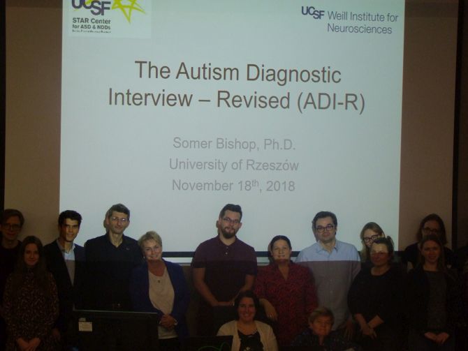 W dniach 18 i 19 listopada, 2018r. na Wydziale Medycznym Uniwersytetu Rzeszowskiego odbyło się pierwsze w Polsce szkolenie ADI-R (Autism Diagnostic Interview- Revised) poprowadzone przez certyfikowanego szkoleniowca ADI-R, doktor Somer Bishop z Department of Psychiatry, University of California, San Francisco, STAR Center for ASD & NDDS, UCSF, San Francisco, USA. Wywiad ADI-R to zrewidowana wersja wystandaryzowanego wywiadu klinicznego, który przeprowadza się z opiekunem pacjenta, u którego podejrzewa się zaburzenie ze spektrum autyzmu. Prowadząca szkolenie ADI-R doktor Somer Bishop jest także współautorem narzędzia ADOS-2, który łącznie z ADI-R zaliczany jest do tzw. „złotego standardu” w procesie diagnozy autyzmu.