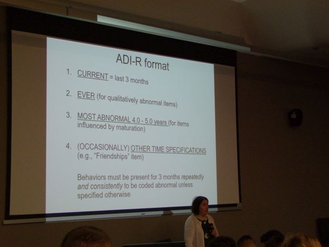 W pierwszym dniu szkolenia, po krótkim wstępie teoretycznym uczestnicy mieli okazję obserwować wykorzystanie wywiadu ADI-R w praktyce. Doktor Bishop przeprowadziła wywiad z rodzicem dziecka, który na tą okoliczność przyjechał do Rzeszowa z odległego Trójmiasta. W celu zapewnienia jak najbardziej komfortowych warunków wywiad z rodzicem odbywał się w odrębnej sali, a słuchacze mieli okazję obserwować cały proces poprzez transmisję na żywo. Po około 3-godzinnym wywiadzie i krótkiej przerwie był czas na dyskusję na temat sposobu kodowania i algorytmu oraz nurtujących pytań z obszaru zaburzeń ze spektrum autyzmu. Drugi dzień szkolenia miał charakter warsztatowy dla zaawansowanej grupy a rodzic wolontariusz pochodził z Rzeszowa.