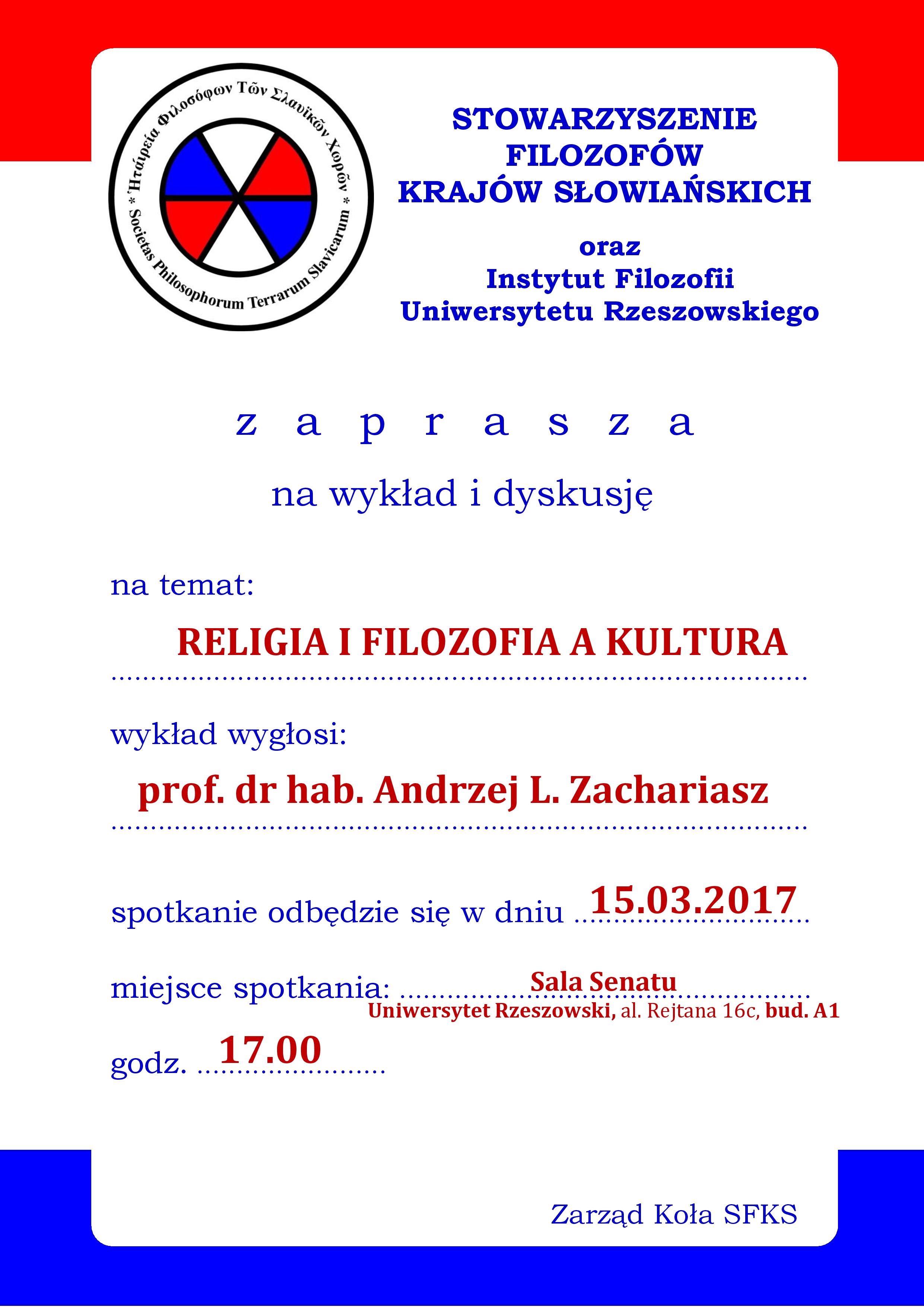 Stowarzyszenie Filozofów Krajów Słowiańskich oraz Instytut Filozofii Uniwersytetu Rzeszowskiego zaprasza na wykład i dyskusję na temat: "Religia i filozofia a kultura". Wykład wygłosi prof. dr hab. Andrzej L. Zachariasz. Spotkanie odbędzie się w dniu 15.03.2017 o godzinie 17.00 w Sali Senatu Uniwersytetu Rzeszowskiego, al. Rejtana 16 C, budynek A1.