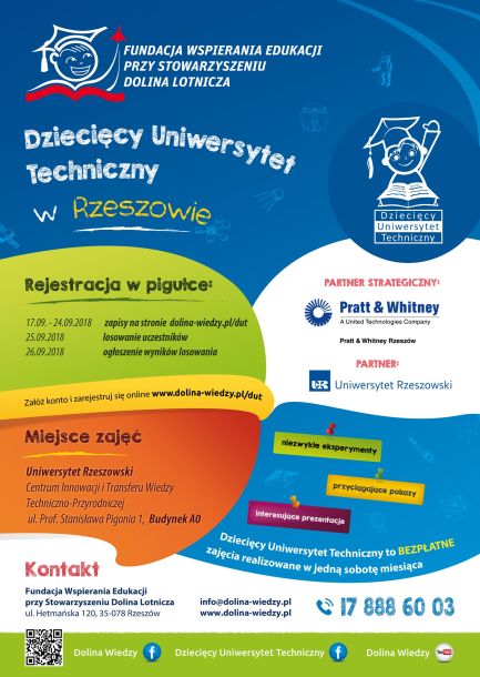 17 września o godz. 10.00 ruszy rejestracja online na nowy semestr zajęć Dziecięcego Uniwersytetu Technicznego. Ponownie 468 dzieci z Podkarpacia zasiądzie w „studenckich ławach”, aby odkrywać fascynujący świat nauki.