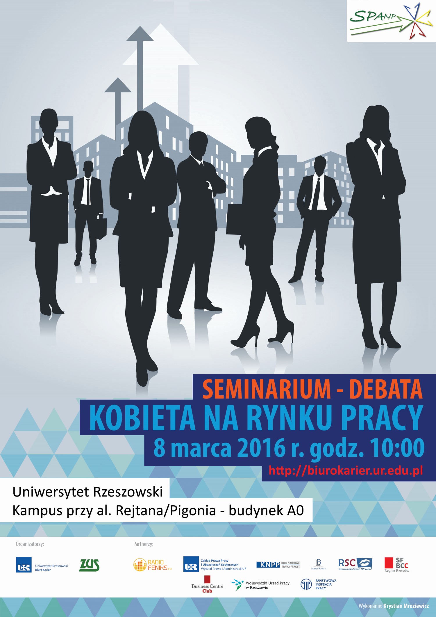 Biuro Karier Uniwersytetu Rzeszowskiego wspólnie z Zakładem Ubezpieczeń Społecznych Oddział Rzeszów organizuje w dniu 8 marca 2016 r. w godz. 10 - 13 w Auli Głównej Budynku A0- ul. Pigonia 1 seminarium wraz z debatą pt. „KOBIETA NA RYNKU PRACY”.