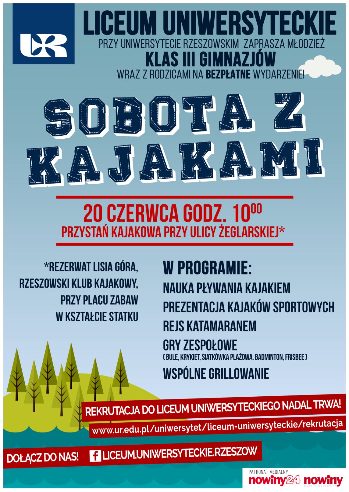 Serdecznie zapraszamy wszystkie Kandydatki oraz wszystkich Kandydatów do Liceum Uniwersyteckiego, wraz z Rodzinami, na wydarzenie pn. "Sobota z kajakami", które odbędzie się 20 czerwca 2015 r. od godz. 10.00 na przystani kajakowej przy ulicy Żeglarskiej w Rzeszowie (rezerwat Lisia Góra, Rzeszowski Klub Kajakowy, plac zabaw w kształcie statku). Podczas spotkania Prorektor ds. Studenckich i Kształcenia dr hab. prof. UR Wojciech Walat zainauguruje działalność Liceum Uniwersyteckiego w roku szkolnym 2015/2016 oraz zaprosi przyszłych Uczniów na uroczyste wręczenie decyzji o przyjęciu do szkoły. W programie pikniku ponadto: nauka pływania kajakiem, prezentacja kajaków sportowych, rejs katamaranem oraz gry zespołowe.