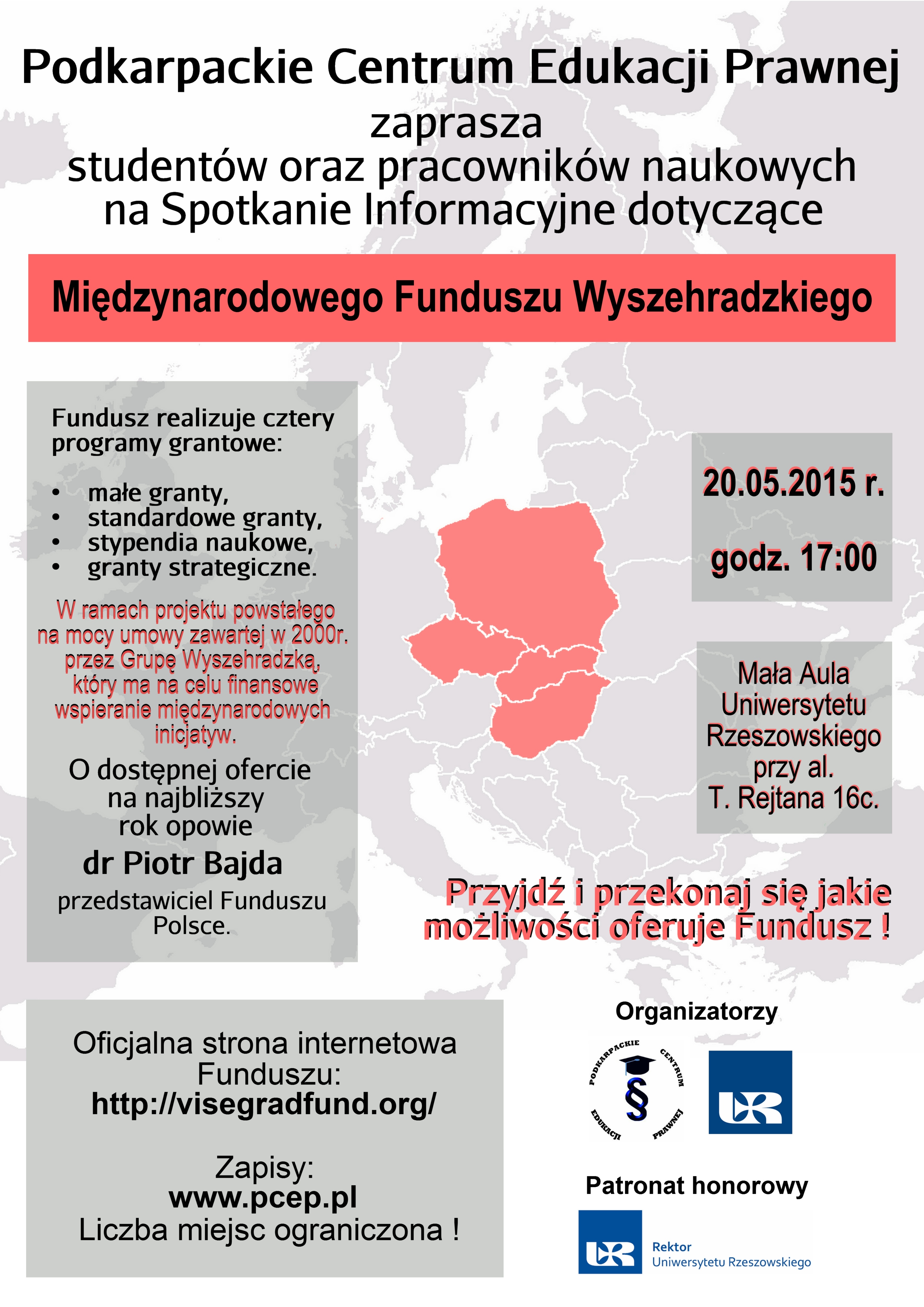 Zapraszamy na Spotkanie Informacyjne dotyczące Międzynarodowego Funduszu Wyszehradzkiego! Wydarzenie odbędzie się 20.05.2015r. o godz. 17:00 w Małej Auli Uniwersytetu Rzeszowskiego przy al. T. Rejtana 16c. Jest to idealna okazja do zapoznania się z bogatą ofertą stypendiów i grantów przyznawanych na realizację różnego rodzaju projektów kulturalnych, naukowych, badawczych, artystycznych a także związanych z wymianą młodzieży. Naszym gościem będzie przedstawiciel Funduszu Wyszehradzkiego w Polsce - Pan dr Piotr Bajda.