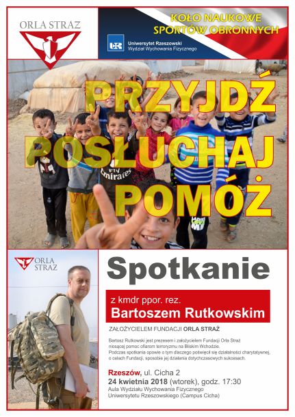 Naszym gościem będzie wyjątkowa osoba - kmdr ppor. rez. Bartosz Rutkowski. To były oficer Marynarki Wojennej RP, obecnie prezes i założyciel Fundacji Orla Straż, pomagającej ludności wyzwolonej z ucisku tzw. Państwa Islamskiego. Serdecznie zapraszamy wszystkich studentów i pracowników Uczelni, 24.04. Wtorek, godz. 17:30 Aula Wydziału WF ul. Cicha 2.