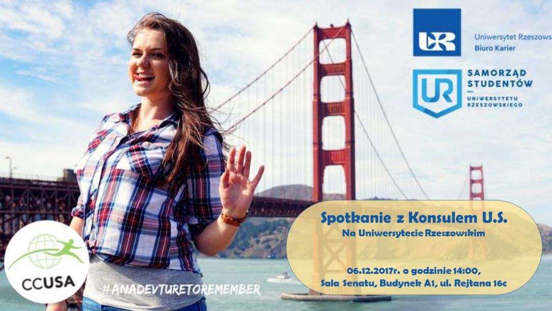 Biuro Karier Uniwersytetu Rzeszowskiego, Samorząd Studentów Uniwersytetu Rzeszowskiego wraz z CCUSAPoland zaprasza serdecznie wszystkich studentów na spotkanie z Konsulem U.S. Consulate General in Krakow Kentem Mullenem, które odbędzie się 6 grudnia 2017 na Uniwersytecie Rzeszowskim o godzinie 14:00, Sala Senatu, Budynek A1, ul. Rejtana 16c