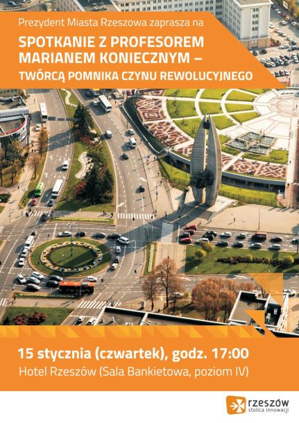 Prezydent Miasta Rzeszowa Tadeusz Ferenc zaprasza na spotkanie z twórcą Pomnika Czynu Rewolucyjnego prof. Marianem Koniecznym w dniu 15 stycznia 2015 r. o godz. 17.00 w Hotelu Rzeszów (sala bankietowa, IV piętro) przy Al. J. Piłsudskiego 44.