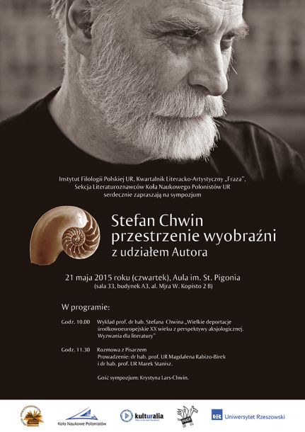 Instytut Filologii Polskiej UR, redakcja kwartalnika literacko-artystycznego „Fraza” oraz Sekcja Literaturoznawców Koła Naukowego Polonistów UR zapraszają na sympozjum „Stefan Chwin – przestrzenie wyobraźni”, które odbędzie się 21 maja w Auli im. S. Pigonia (sala 33, al. mjr. W. Kopisto 2 B). Gościem sympozjum będzie jeden z najwybitniejszych współczesnych polskich pisarzy Stefan Chwin, autor m.in. powieści Hanemann, Esther, Złoty pelikan i Dolina radości.