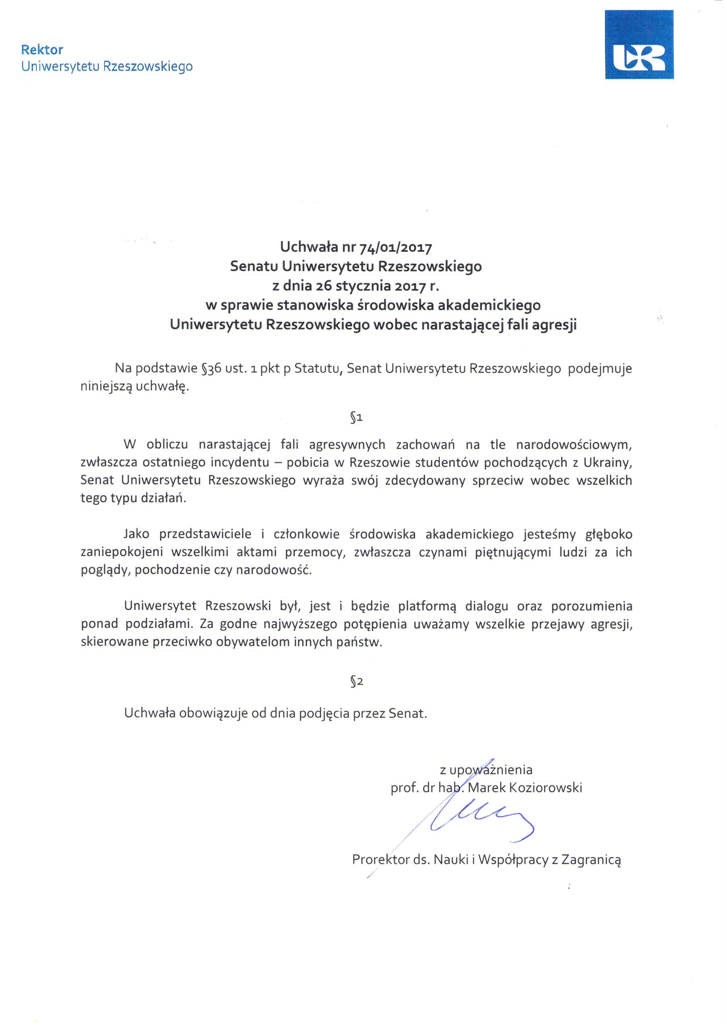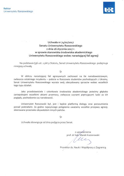 W obliczu narastającej fali agresywnych zachowań na tle narodowościowym, zwłaszcza ostatniego incydentu – pobicia w Rzeszowie studentów pochodzących z Ukrainy, Senat Uniwersytetu Rzeszowskiego wyraża swój zdecydowany sprzeciw wobec wszelkich tego typu działań.