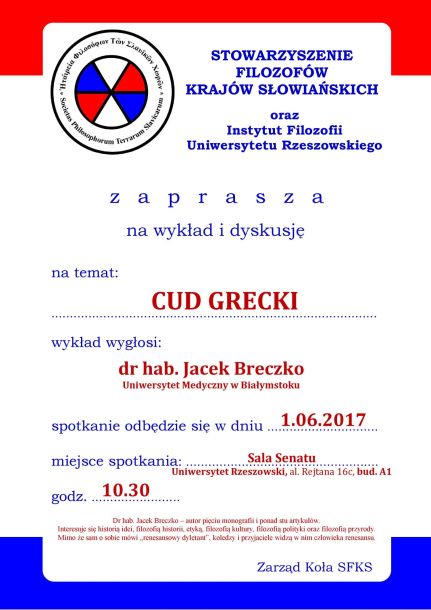 Stowarzyszenie Filozofów Krajów Słowiańskich oraz Instytut Filozofii UR zaprasza na wykład i dyskusję na temat: CUD GRECKI.