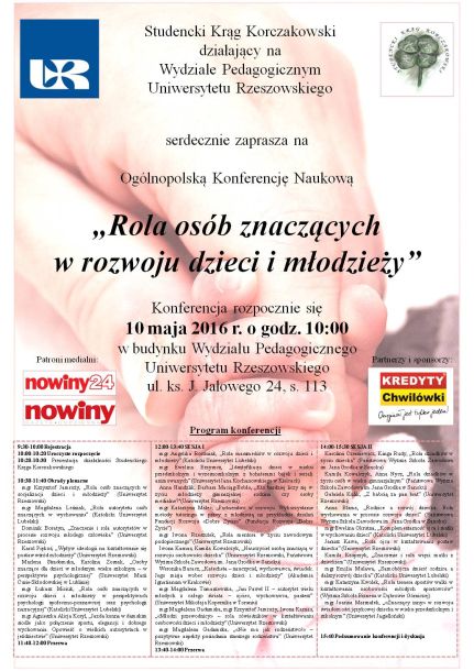 Studencki Krąg Korczakowski działający na Wydziale Pedagogicznym Uniwersytetu Rzeszowskiego serdecznie zaprasza na Ogólnopolską Konferencję Naukową "Rola osób znaczących w rozwoju dzieci i młodzieży", która rozpocznie się 10 maja 2016 r. o godz. 10:00 w budynku Wydziału Pedagogicznego UR, ul. ks. J. Jałowego 24, s. 113. Patronem medialnym wydarzenia jest Gazeta Codzienna "Nowiny" oraz portal "nowiny24".