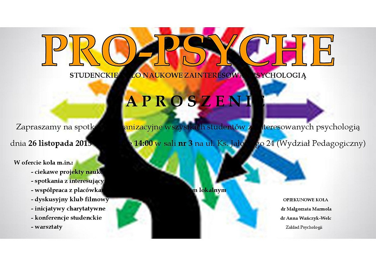 Zapraszamy na spotkanie organizacyjne wszystkich studentów zainteresowanych psychologią dnia 26 listopada 2015 o godzinie 14:00 w sali nr 3 na ul. Ks. Jałowego 24 (Wydział Pedagogiczny).