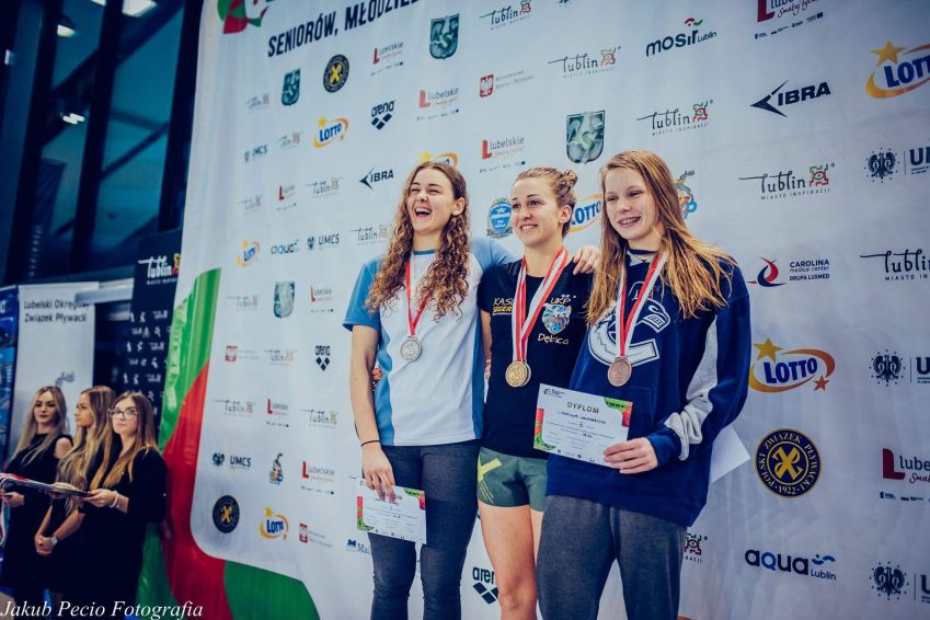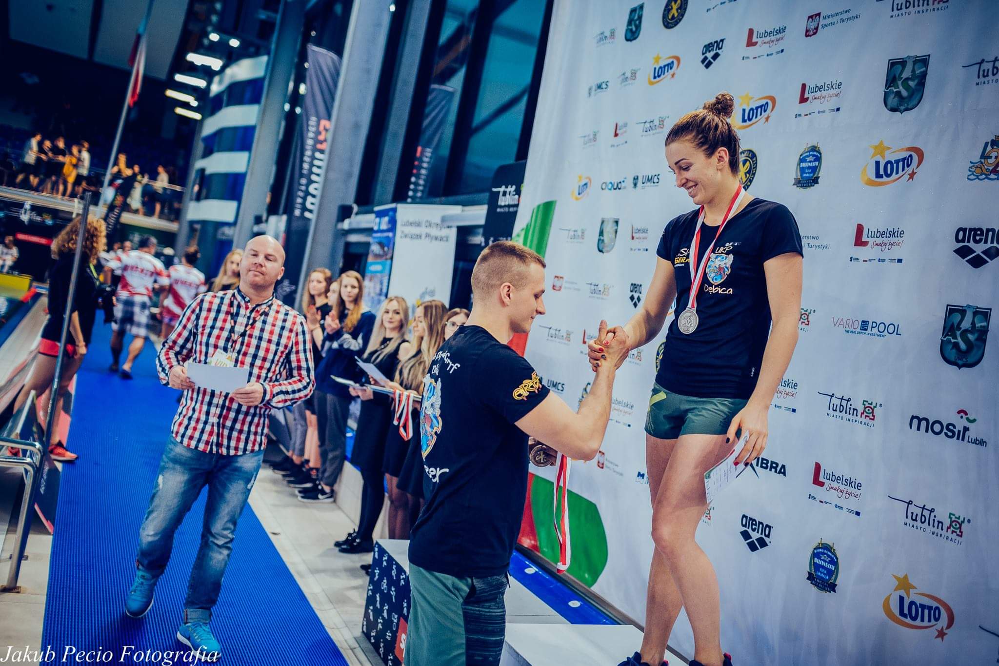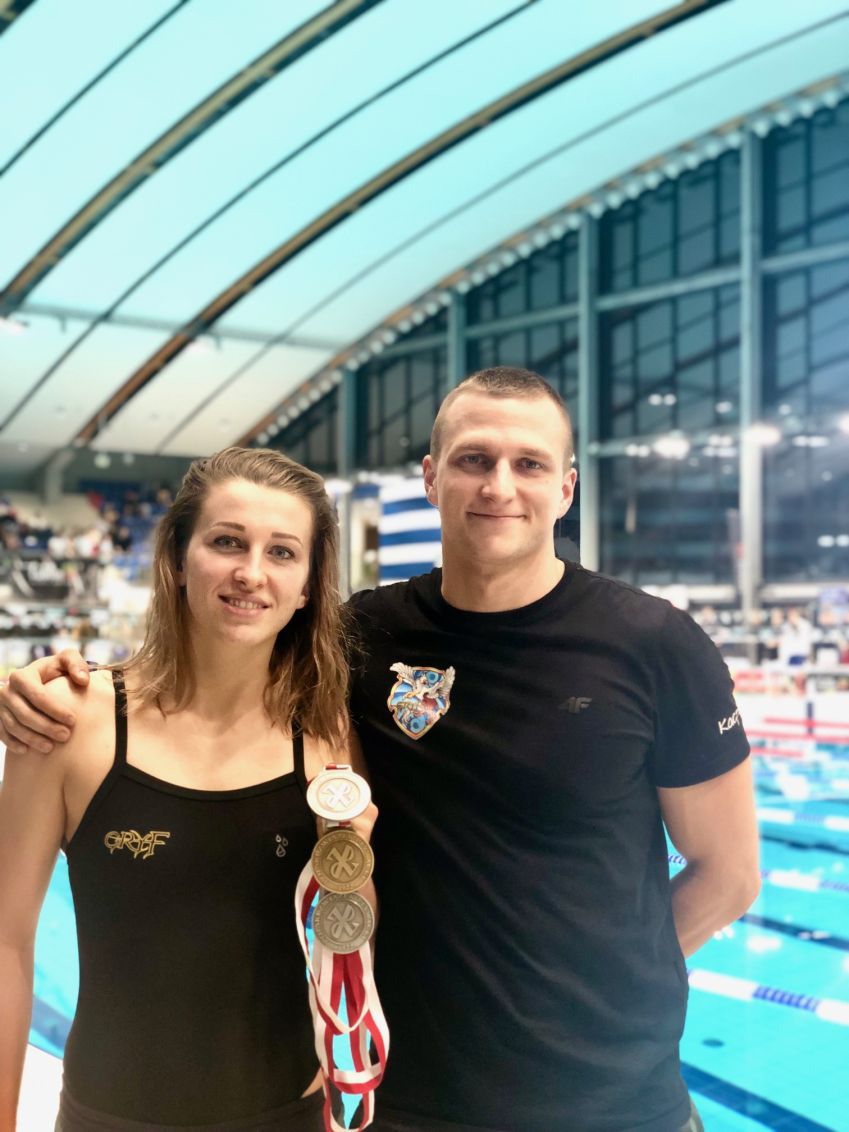 Ponadto zdobyła złoty medal w kategorii młodzieżowców na tym dystansie i srebrny na dystansie 50 m stylem motylkowym. Na zdjęciach Katarzyna Górniak z medalami i swoim trenerem Kacprem Farą (tegorocznym absolwentem UR – kierunek WF) .