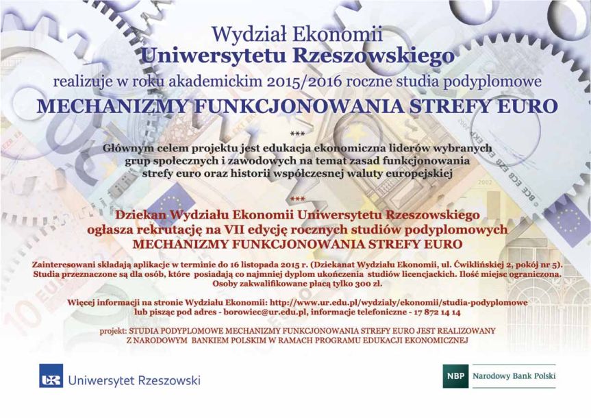 Z radością informujemy, że Wydział Ekonomii Uniwersytetu Rzeszowskiego po raz siódmy będzie realizował (w roku akademickim 2015/2016) grant Narodowego Banku Polskiego – studia podyplomowe Mechanizmy funkcjonowania strefy euro. Projekt ten zyskał dofinansowanie NBP i uczestnictwo w rocznym programie zajęć związane jest