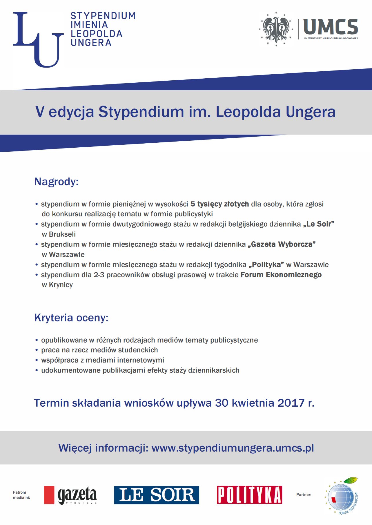 Stypendium im. Leopolda Ungera przyznawane jest od 2013 roku. Mogą się o nie ubiegać studenci wszystkich kierunków i stopni kształcenia oraz młodzi dziennikarze do 35. roku życia, wyróżniający się wybitnymi osiągnięciami. Kapituła Stypendium, oceniając kandydatów, w szczególności bierze pod uwagę opublikowane w różnych rodzajach mediów tematy publicystyczne, pracę na rzecz mediów studenckich, współpracę z mediami internetowymi oraz udokumentowane publikacjami efekty staży dziennikarskich.