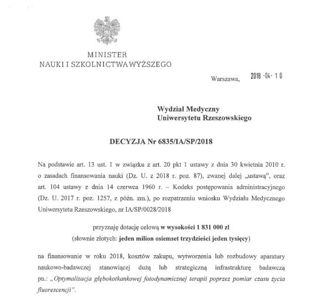Optymalizacja głębokotkankowej fotodynamicznej terapii poprzez pomiar czasu życia fluorescencji to tytuł projektu zgłoszony przez Dr hab. n med. Davida Aebisher do konkursu o przyznanie środków finansowych na zakup aparatury naukowobadawczej stanowiącej dużą infrastrukturę badawcza na lata 2018-2019.