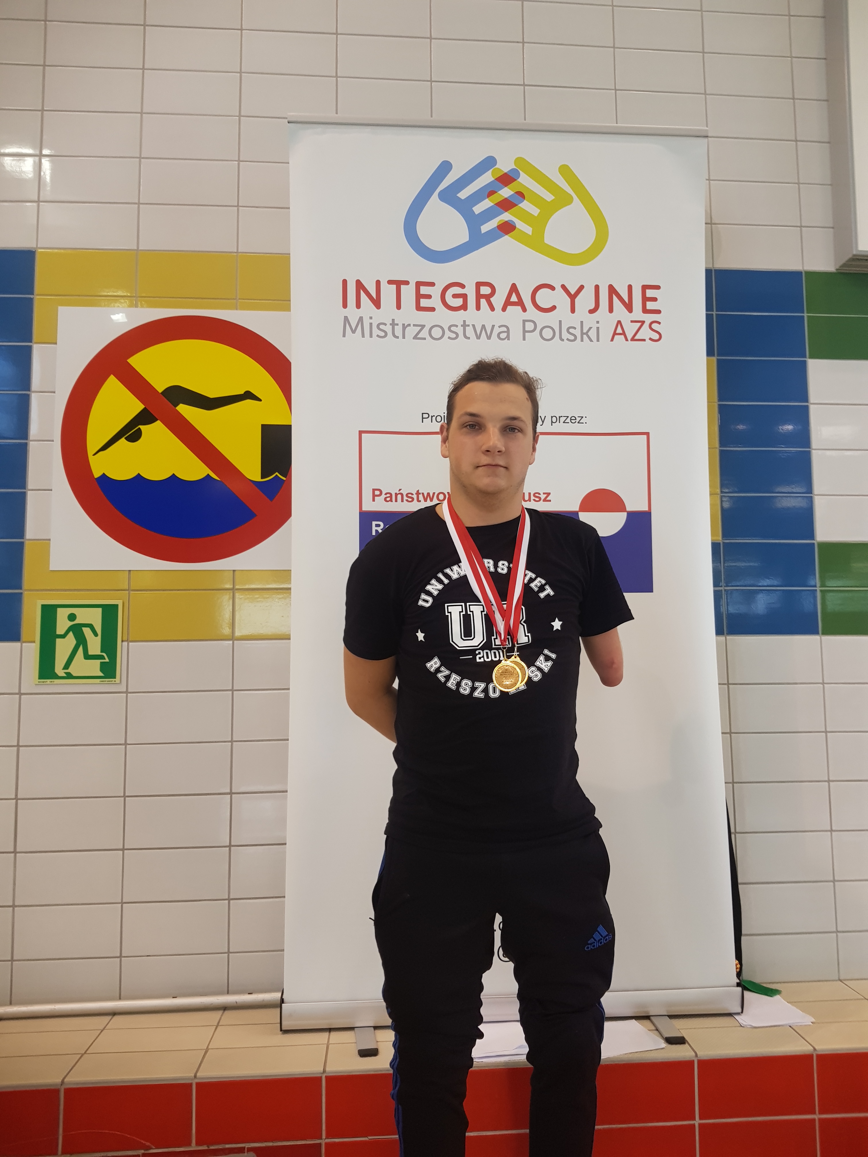 Miło nam poinformować że podczas odbywających się w dniu 12 maja 2018 r. w Poznaniu III Integracyjnych Mistrzostw Polski AZS w Pływaniu Mateusz Zięba student III roku na Wydziale Prawa i Administracji, reprezentujący Biuro ds. Osób Niepełnosprawnych oraz Klub Uczelniany AZS Uniwersytetu Rzeszowskiego zdobył dwa złote medale na dystansach 25 m i 50 m stylem dowolnym. Warto wspomnieć że nasz zawodnik w mistrzostwach brał udział po raz trzeci i zdobył w sumie 6 złotych medali. Drugi z naszych reprezentantów student kierunku administracja, na dystansie 50 m stylem klasycznym zdobył brązowy medal. Zawodnicy na co dzień pływają pod okiem trenerów mgr Artura Szymańskiego i dr Iwony Tabaczek-Bejster. Składamy gratulacje i czekamy na medale w kolejnych latach.