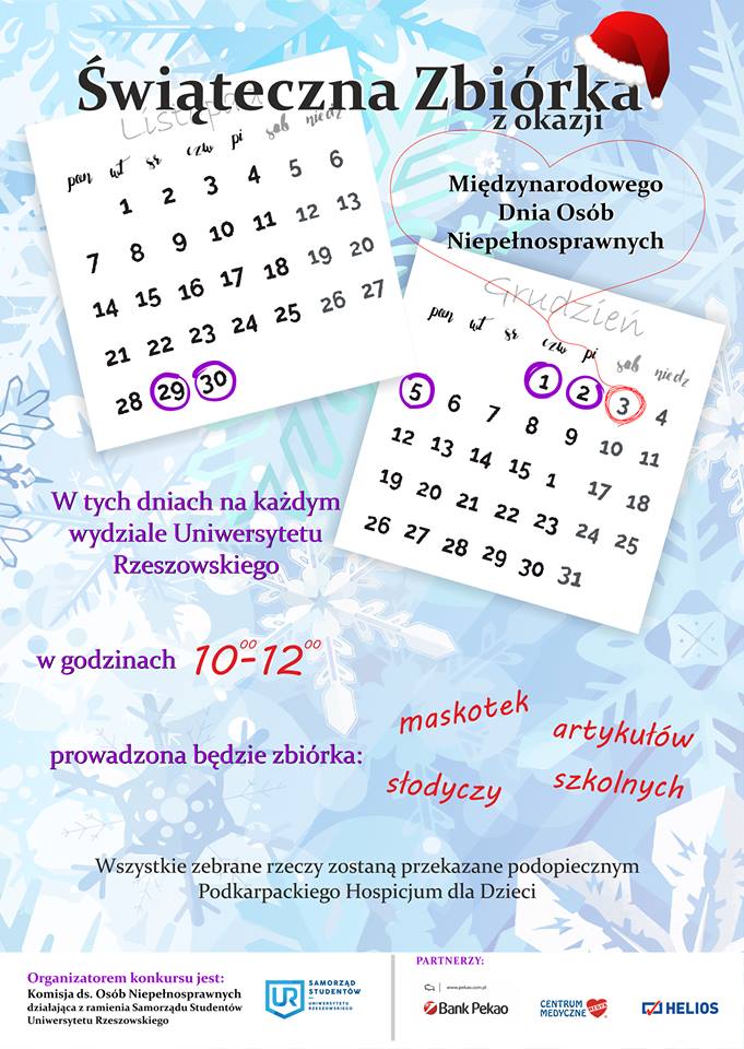 Drodzy studenci ! W związku z obchodzonym 3 grudnia Międzynarodowym Dniem Osób Niepełnosprawnych Komisja ds. Osób Niepełnosprawnych działająca przy Samorządzie Studentów Uniwersytetu Rzeszowskiego organizuje na wszystkich Wydziałach UR zbiórkę maskotek, słodyczy, artykułów szkolnych, które zostaną przekazane podopiecznym Podkarpackiego Hospicjum dla Dzieci.