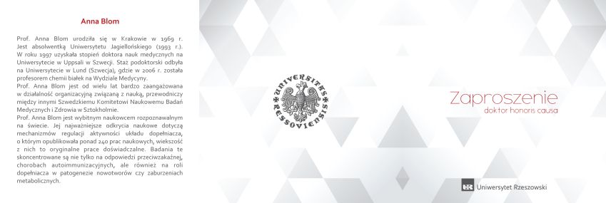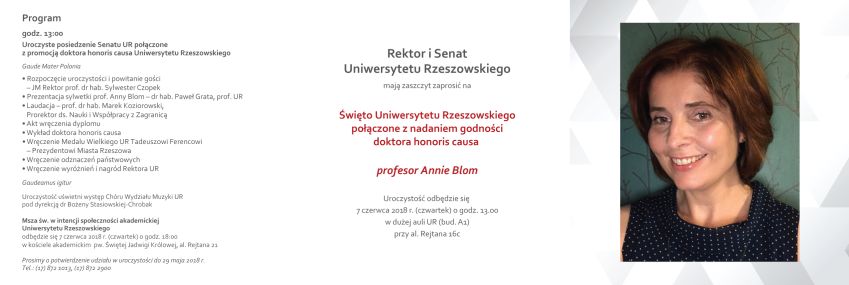 7 czerwca 2018 r. odbędzie się święto Uniwersytetu Rzeszowskiego. Podczas pięknej uroczystości akademickiej odbędą się promocje doktorów i doktorów habilitowanych, wręczenie Medalu Wielkiego UR Panu Prezydentowi Tadeuszowi Ferencowi oraz nadanie godności doktora honoris causa prof. Annie Blom.