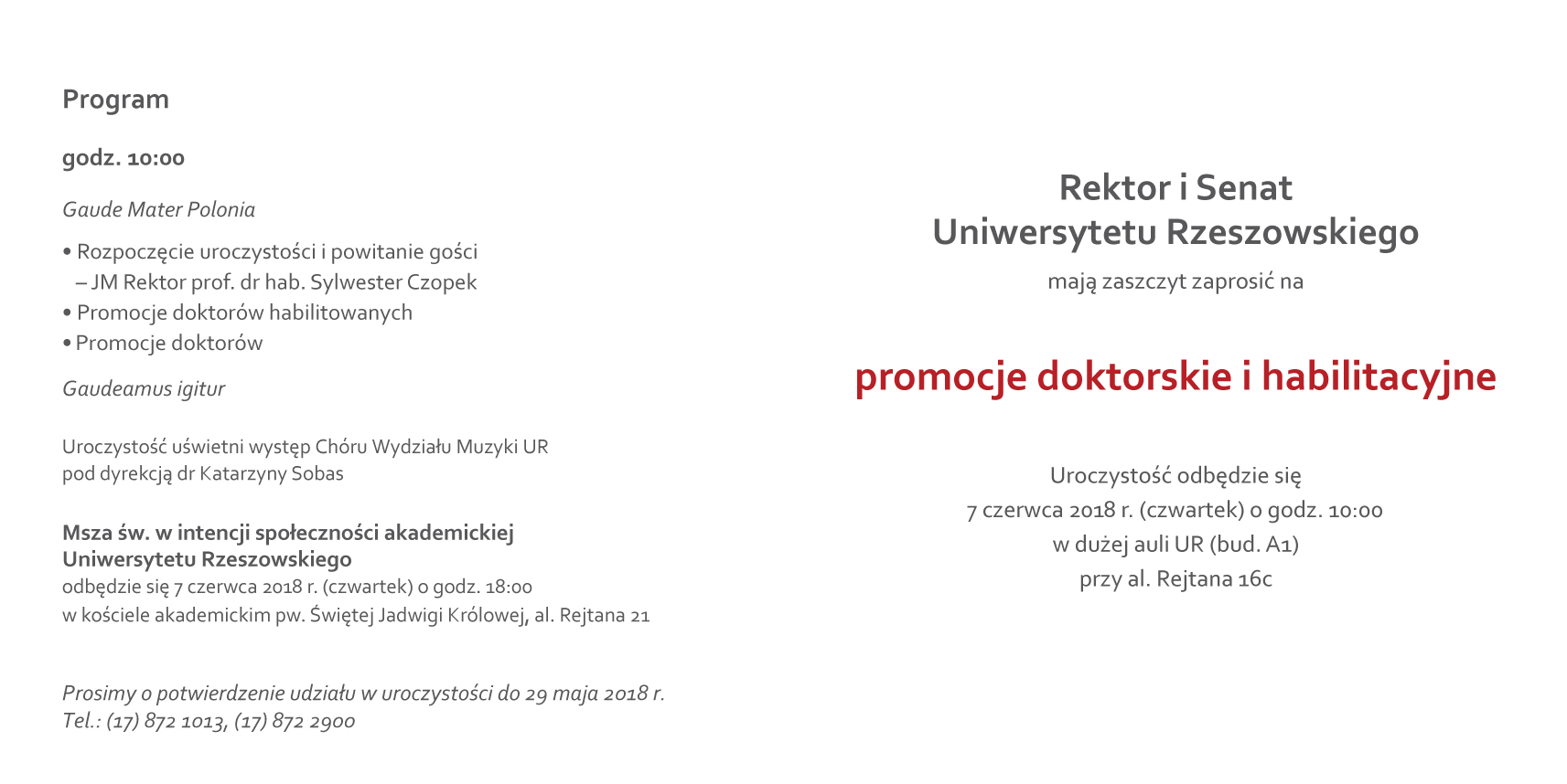 Zapraszamy serdecznie do wzięcia udziału w uroczystości, która odbędzie się w Dużej Auli UR, Al. T. Rejtana 16c (bud. A1).