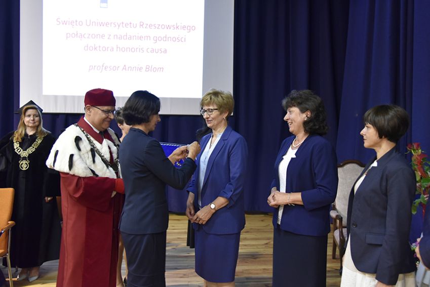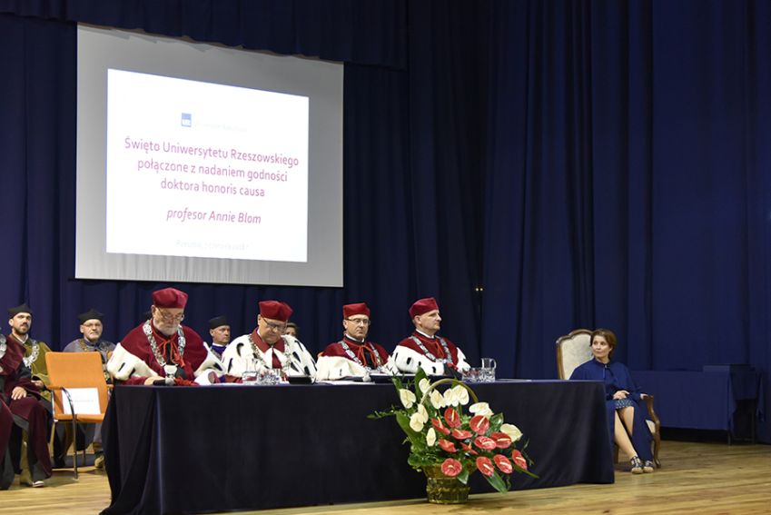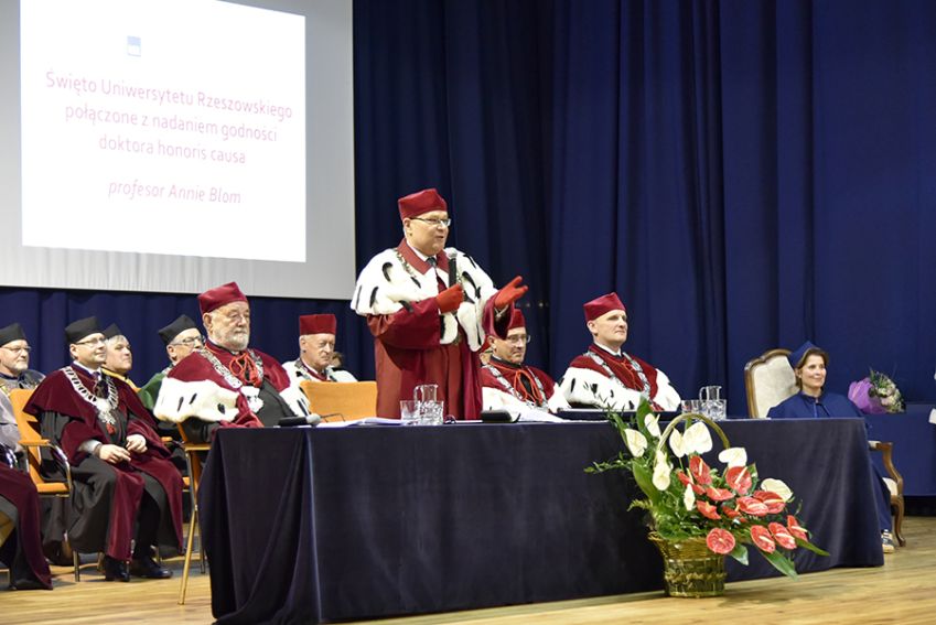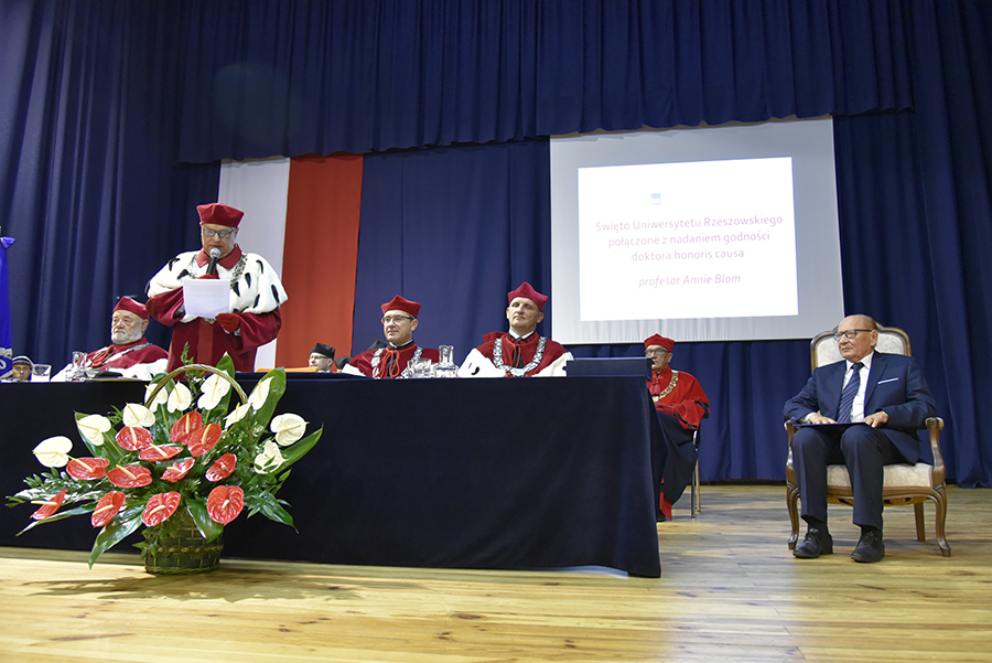 Na początku Jego Magnificencja powitał zgromadzonych na uroczystości nadania godności doktora honoris causa Pani prof. Annie Blom. Sylwetkę doktora honorowego prezentował dr hab. Paweł Grata, prof. UR, Dziekan Wydziału Socjologiczno-Historycznego. Laudację wygłosił prof. dr hab. Marek Koziorowski z Wydziału Biotechnologii.