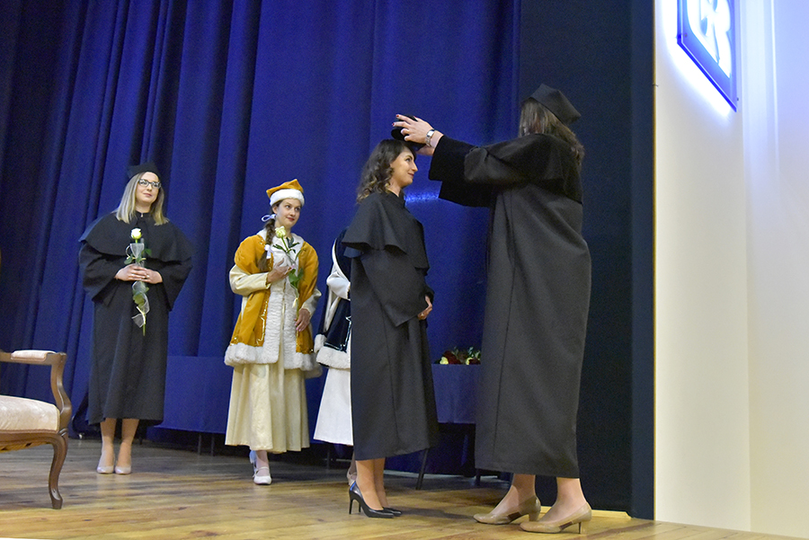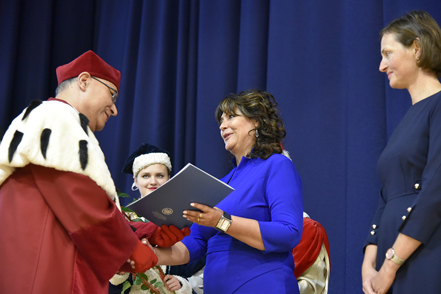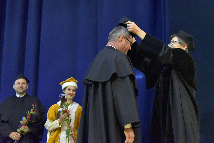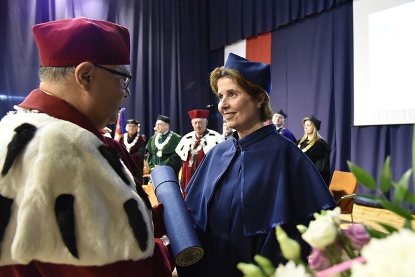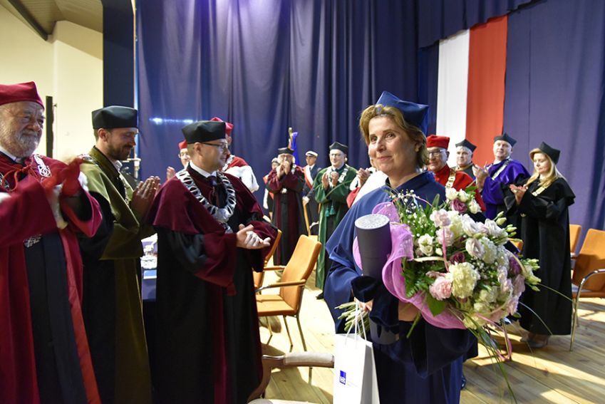Jako potwierdzenie przyznanej godności akademickiej Dziekan Wydziału Socjologiczno-Historycznego nałożył Pani profesor biret doktorski, a Jego Magnificencja wręczył dyplom.