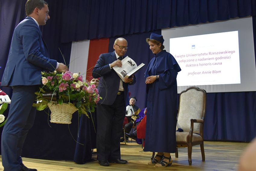 Potem głos mogli zabrać zgromadzeni goście oraz przedstawione zostały adresy gratulacyjne dla prof. Anny Blom. Gratulacje Pani Profesor złożyli osobiście: Prezydent Rzeszowa, Pan Tadeusz Ferenc i Wicemarszałek woj. podkarpackiego, Pan Stanisław Kruczek. List dla doktor honorowej przesłał Marszałek Sejmu RP, Pan Marek Kuchciński oraz przedstawiciele licznych instytucji i uczelni z całej Polski.