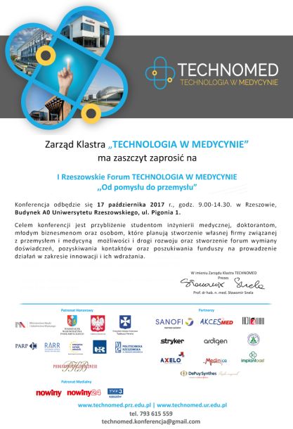 Zarząd Klastra "Technologia w medycynie" zaprasza na I Rzeszowskie Forum Technologia w medycynie - od pomysłu do przemysłu. Konferencja odbędzie się 17 października 2017r. w Rzeszowie w Budynku A0 Uniwersytetu Rzeszowskiego, ul Pigonia 1.