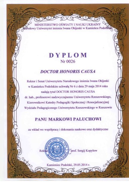 W dniu 29 maja 2014 r. Rektor i Senat Uniwersytetu Narodowego imienia Iwana Ohijenki w Kamieńcu Podolskim nadał tytuł Doctora Honoris Causa dr hab. prof. UR Markowi Paluchowi, pracownikowi naukowemu Wydziału Pedagogicznego UR.