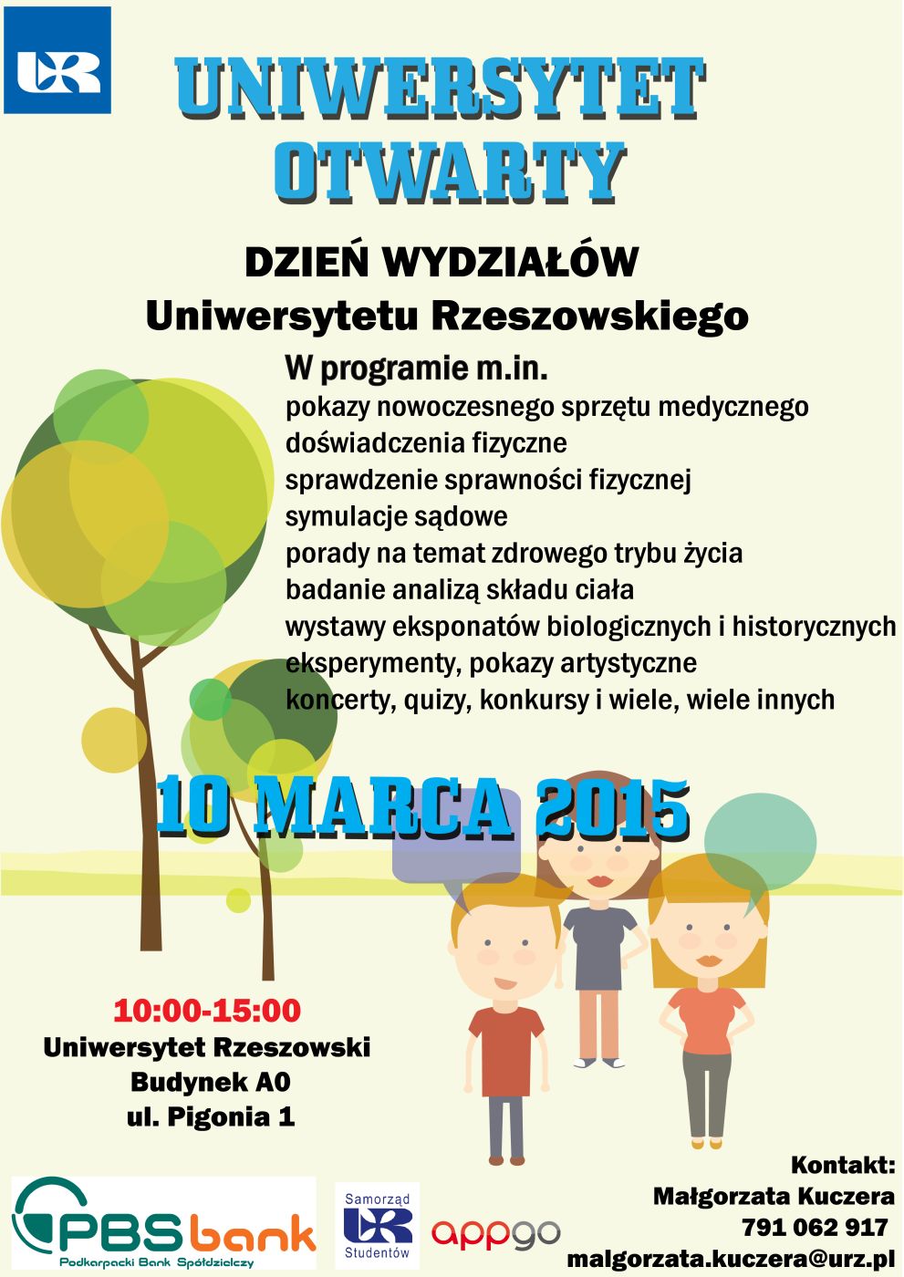 Uniwersytet Otwarty - Dzień Wydziałów Uniwersytetu Rzeszowskiego to projekt skierowany do maturzystów, którym chcemy stworzyć możliwość zapoznania się z ofertą edukacyjną naszej Uczelni, wzbogaconą o nowe kierunki studiów. Zaprezentowany zostanie także harmonogram rekrutacji oraz nowoczesne centra badawcze. Uczniowie doświadczą prawdziwej akademickiej atmosfery – a wszystko za sprawą licznych pokazów, atrakcji, quizów i konkursów przygotowanych przez naszych studentów.