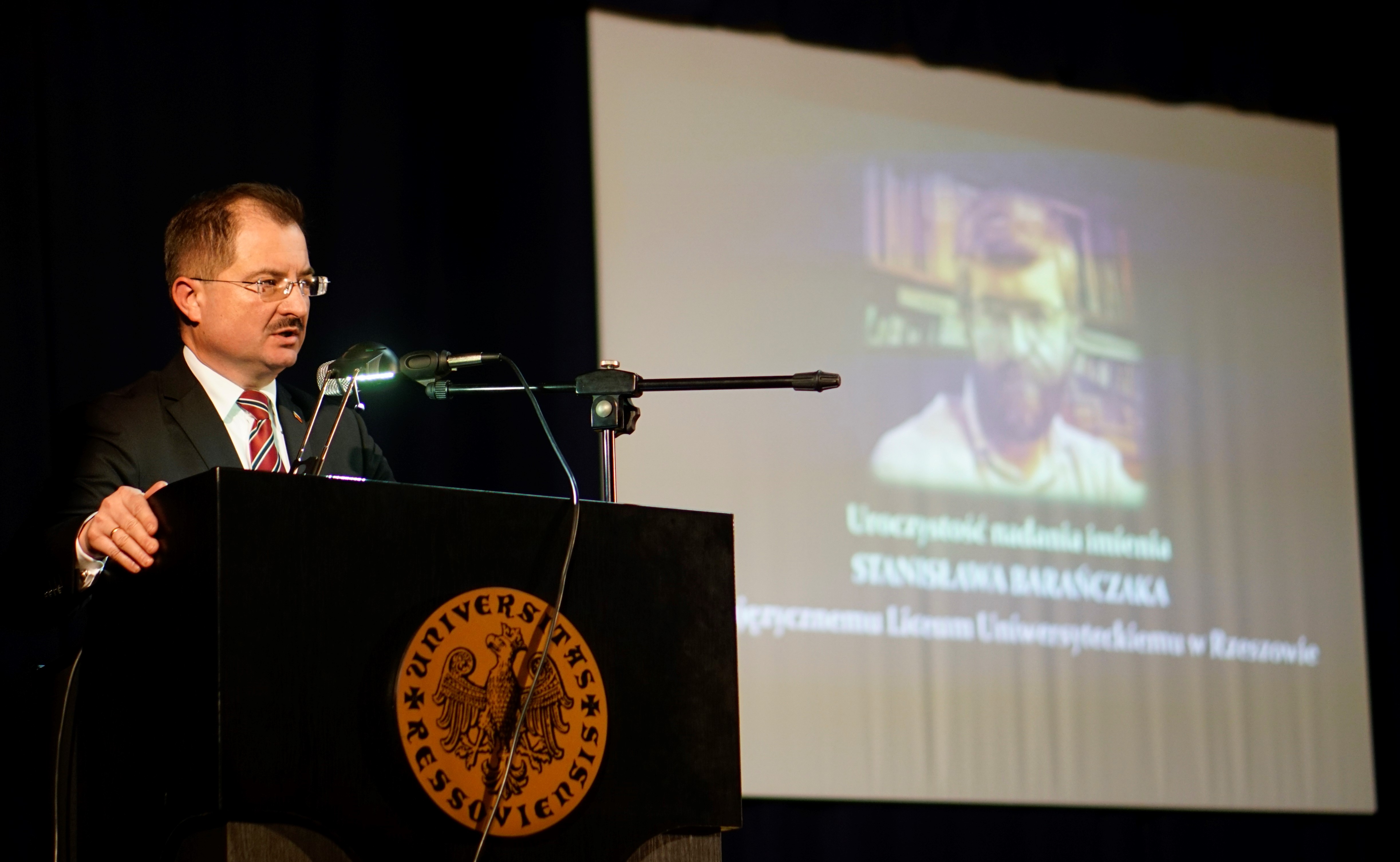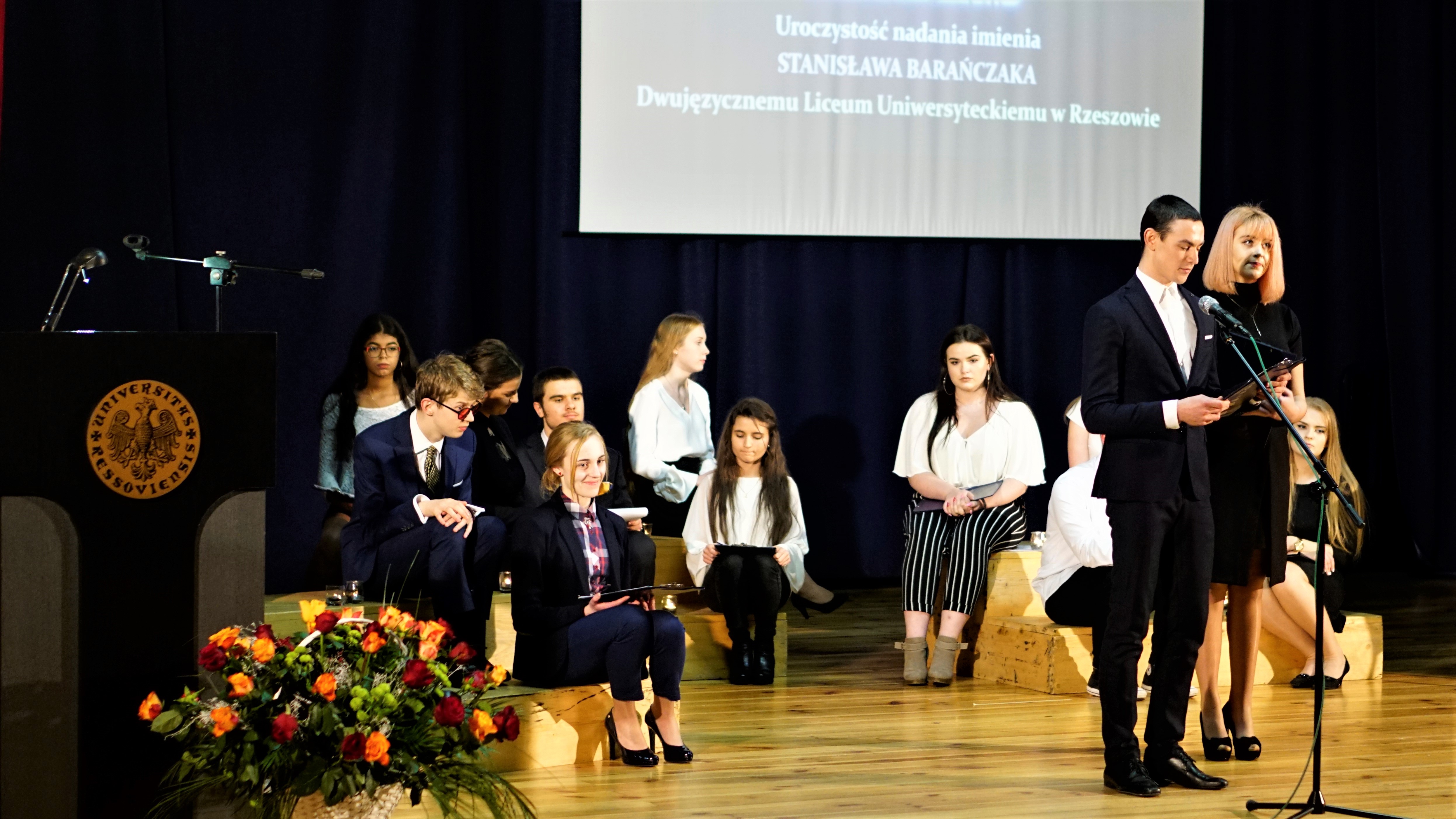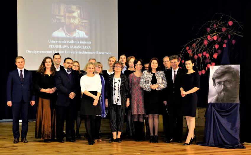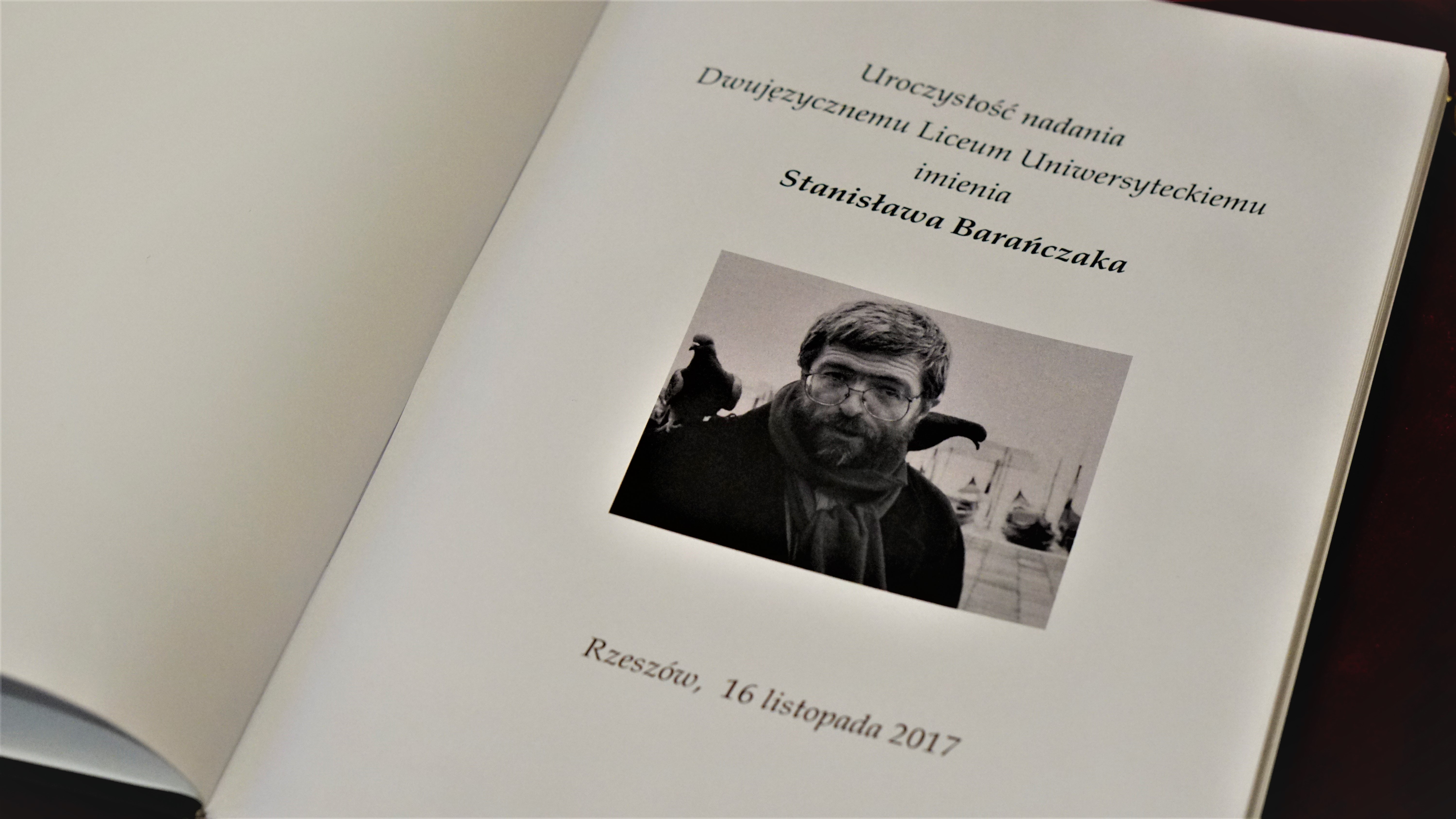 16 listopada 2017 r. odbyła się uroczystość nadania imienia Stanisława Barańczaka Dwujęzycznemu Liceum Uniwersyteckiemu. Uczestniczyli w niej: Przewodniczący Rady Miasta Rzeszowa Andrzej Dec, Wiceprzewodniczący Rady Miasta Rzeszowa Waldemar Szumny oraz radni: Jolanta Kaźmierczak, Maria Warchoł i Sławomir Gołąb. Podkarpackiego Kuratora Oświaty reprezentowała Bożena Pasieka, dyrektor Wydziału Jakości i Zarządzania Edukacją. Obecny był także Prorektor ds. Studenckich i Kształcenia Uniwersytetu Rzeszowskiego dr hab. prof. UR Wojciech Walat, a ponadto Dziekani: Wydziału Prawa i Administracji - dr hab. prof. UR Elżbieta Feret, Wydziału Filologicznego - dr hab. prof. UR Zenon Ożóg oraz Wydziału Socjologiczno-Historycznego - dr hab. prof. UR Paweł Grata. W tym ważnym wydarzeniu wzięli także udział: Dyrektor DLU dr Anna Pięta-Szawara, zastępca dyrektora DLU mgr Agnieszka Huzarska, nauczyciele, rodzice i uczniowie liceum.
