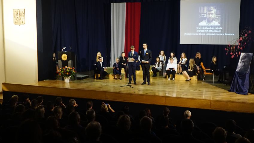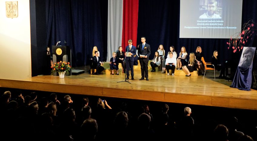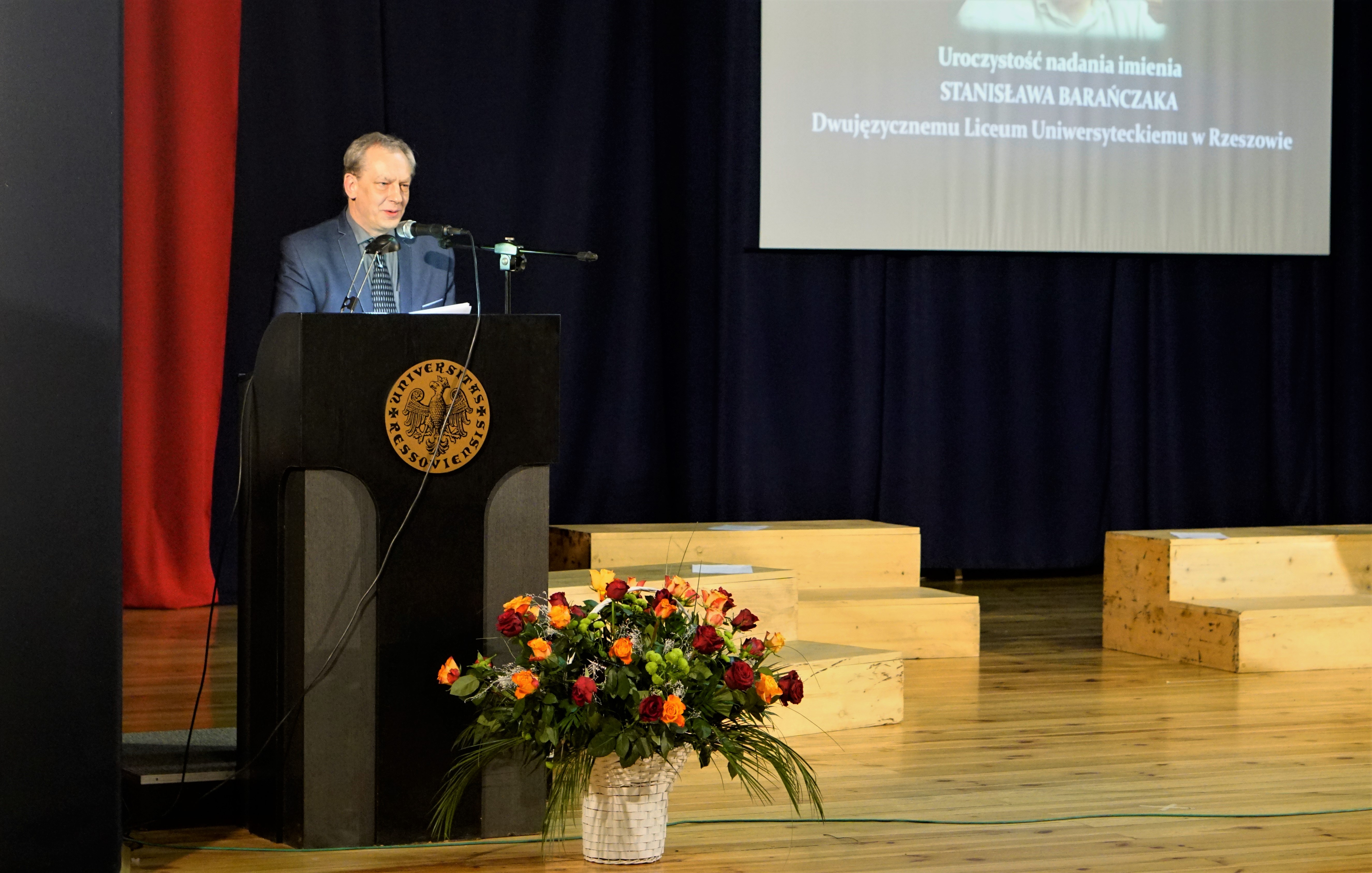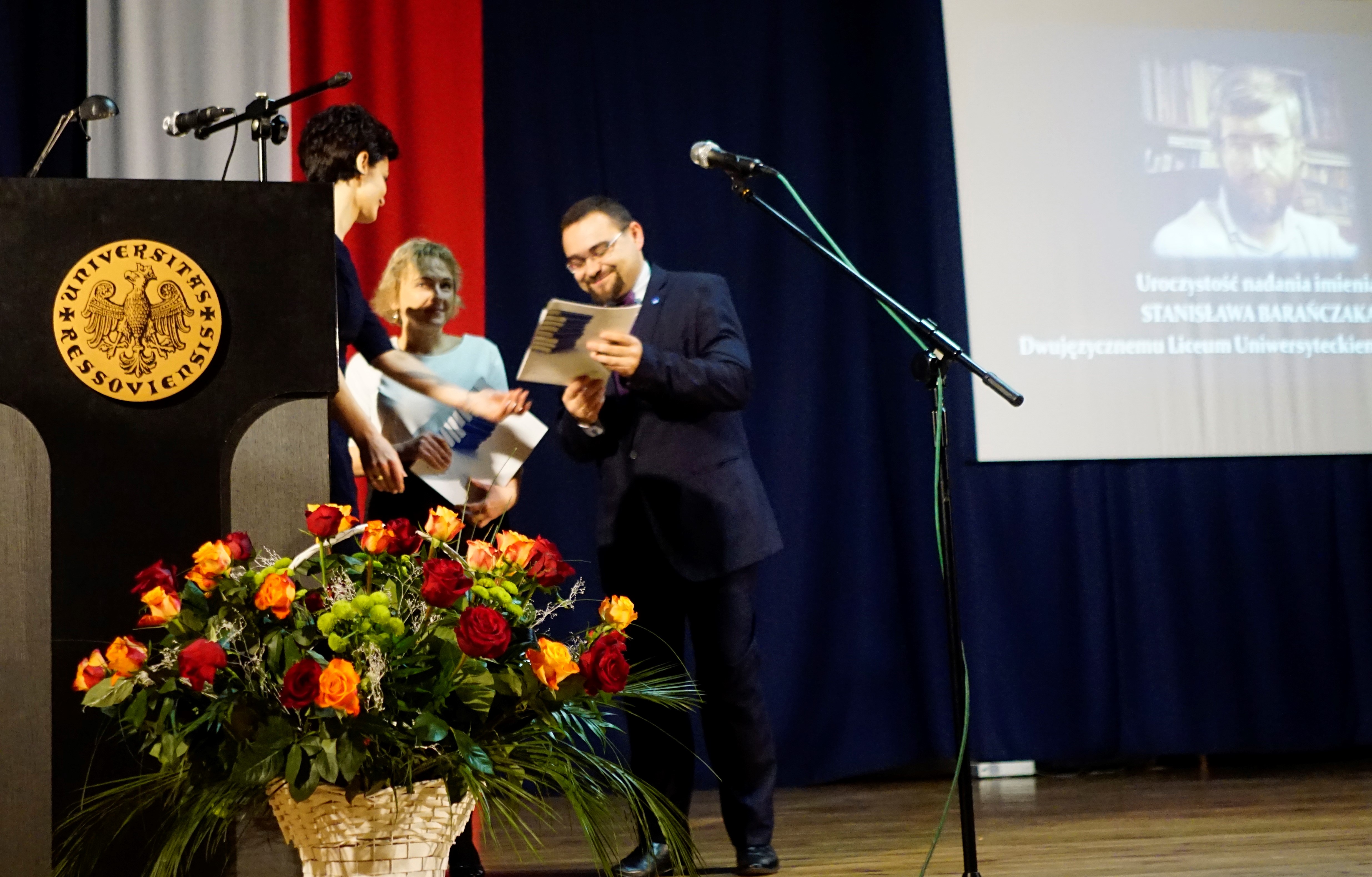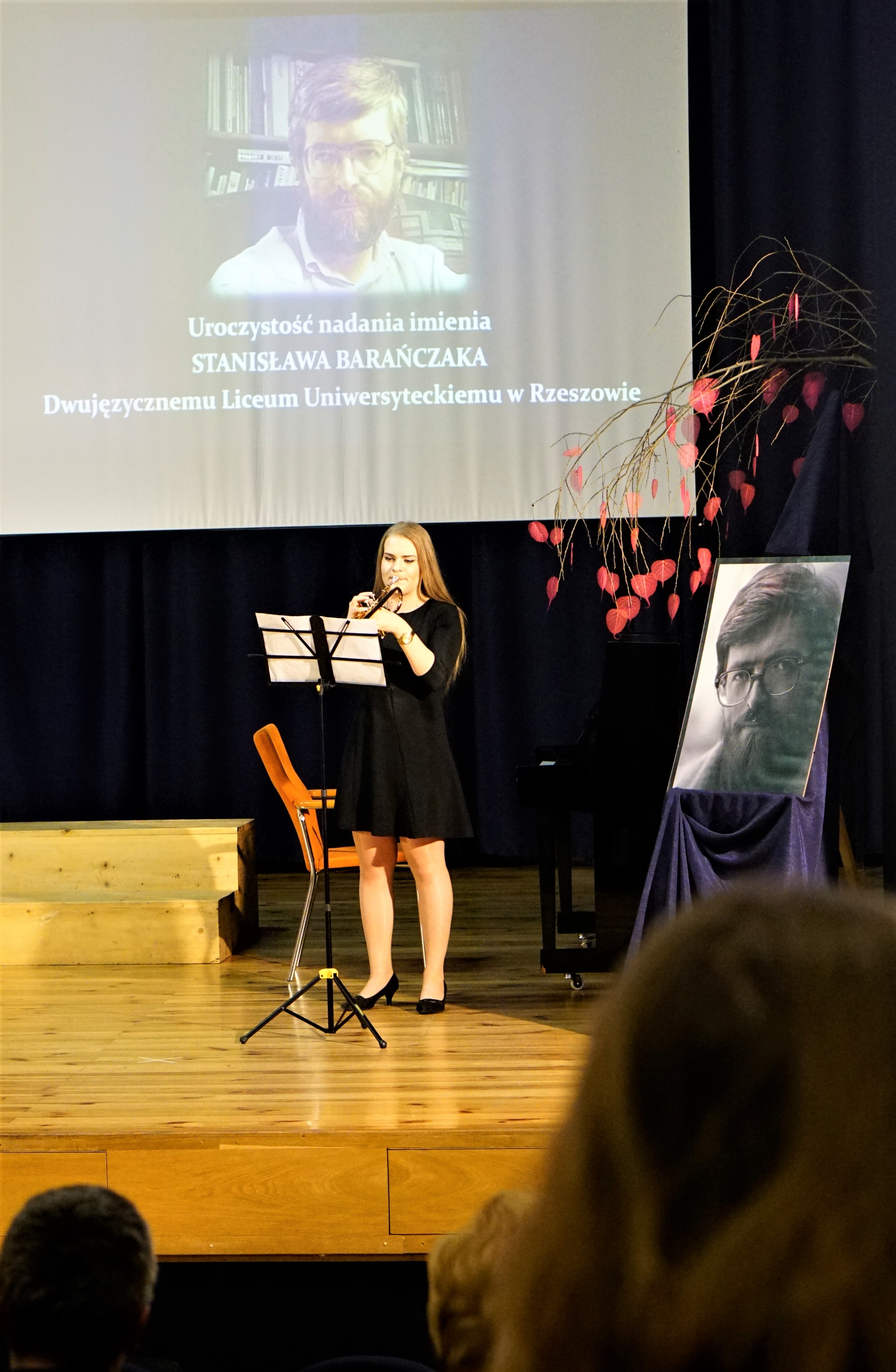 16 listopada 2017 r. odbyła się uroczystość nadania imienia Stanisława Barańczaka Dwujęzycznemu Liceum Uniwersyteckiemu. Uczestniczyli w niej: Przewodniczący Rady Miasta Rzeszowa Andrzej Dec, Wiceprzewodniczący Rady Miasta Rzeszowa Waldemar Szumny oraz radni: Jolanta Kaźmierczak, Maria Warchoł i Sławomir Gołąb. Podkarpackiego Kuratora Oświaty reprezentowała Bożena Pasieka, dyrektor Wydziału Jakości i Zarządzania Edukacją. Obecny był także Prorektor ds. Studenckich i Kształcenia Uniwersytetu Rzeszowskiego dr hab. prof. UR Wojciech Walat, a ponadto Dziekani: Wydziału Prawa i Administracji - dr hab. prof. UR Elżbieta Feret, Wydziału Filologicznego - dr hab. prof. UR Zenon Ożóg oraz Wydziału Socjologiczno-Historycznego - dr hab. prof. UR Paweł Grata. W tym ważnym wydarzeniu wzięli także udział: Dyrektor DLU dr Anna Pięta-Szawara, zastępca dyrektora DLU mgr Agnieszka Huzarska, nauczyciele, rodzice i uczniowie liceum.