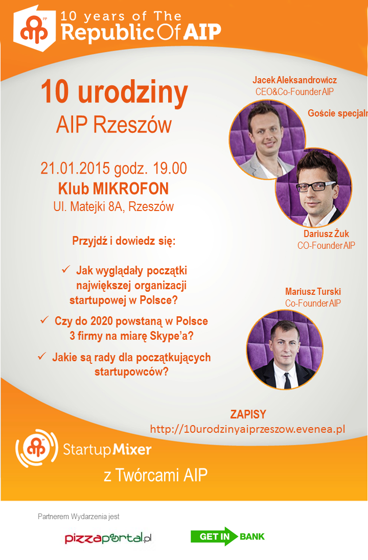 Już niedługo, bo 21 stycznia 2015 r. w Rzeszowie odbędzie się StartUp Mixer, czyli znana w środowisku startupowym impreza promocyjno-edukacyjna organizowana przez Inkubatory AIP. Tym razem gośćmi specjalnymi będą założyciele największej sieci inkubatorów w Europie – Jacek Aleksandrowicz, Dariusz Żuk i Mariusz Turski.