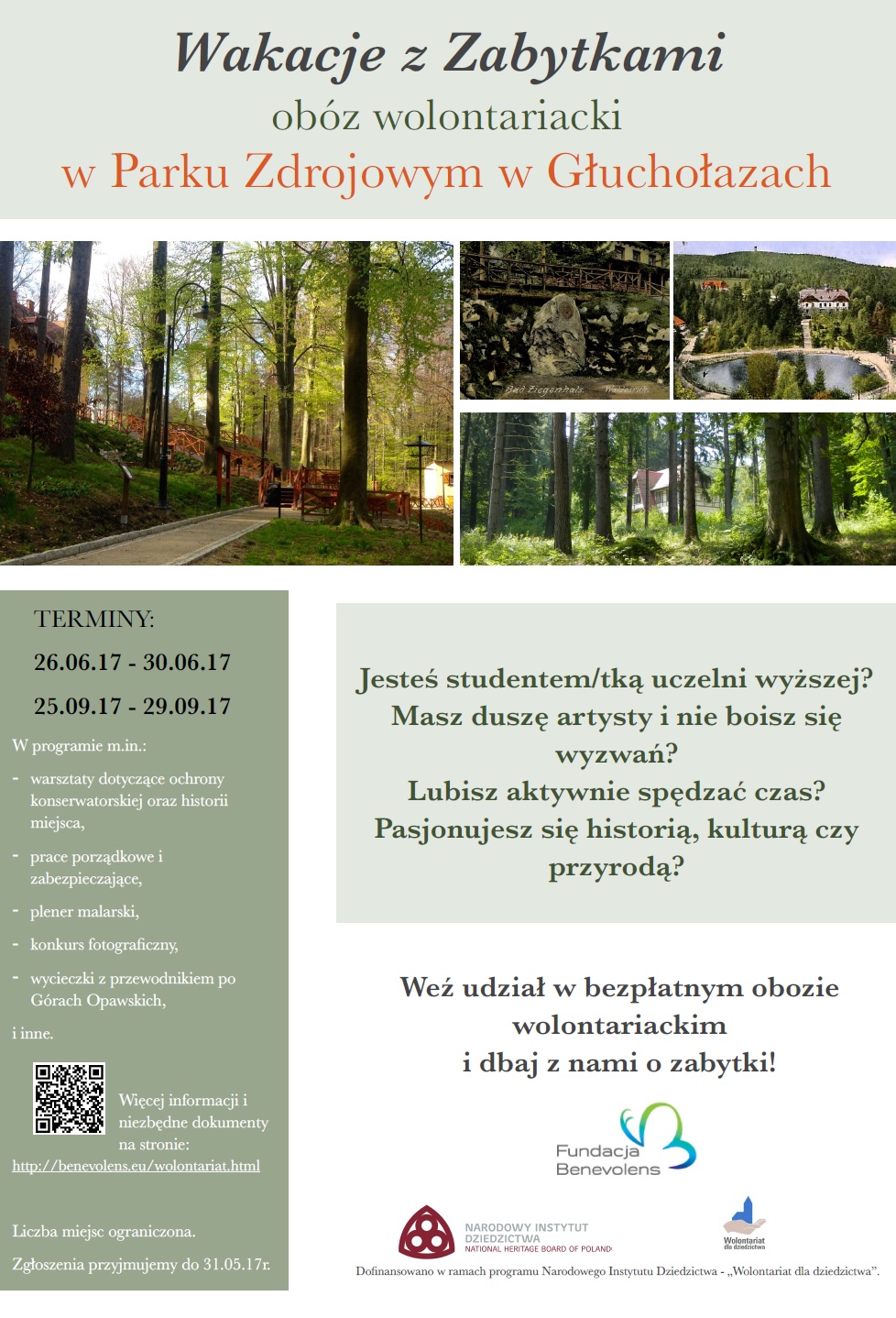 Fundacja Benevolens zaprasza na obóz wolontariacki w Głuchołazach (woj. opolskie). Będziesz mógł/a spędzić pięć dni w uzdrowiskowej miejscowości w Górach Opawskich, w malowniczym, zabytkowym parku, poznać historię oraz klimat tego miejsca, zagadnienia związane z dziedzictwem kulturowym, jego ochroną, inwentaryzacją i rozpowszechnianiem, zapoznasz się też z architekturą i różnorodnością przyrodniczą charakterystyczną dla tego miejsca.
