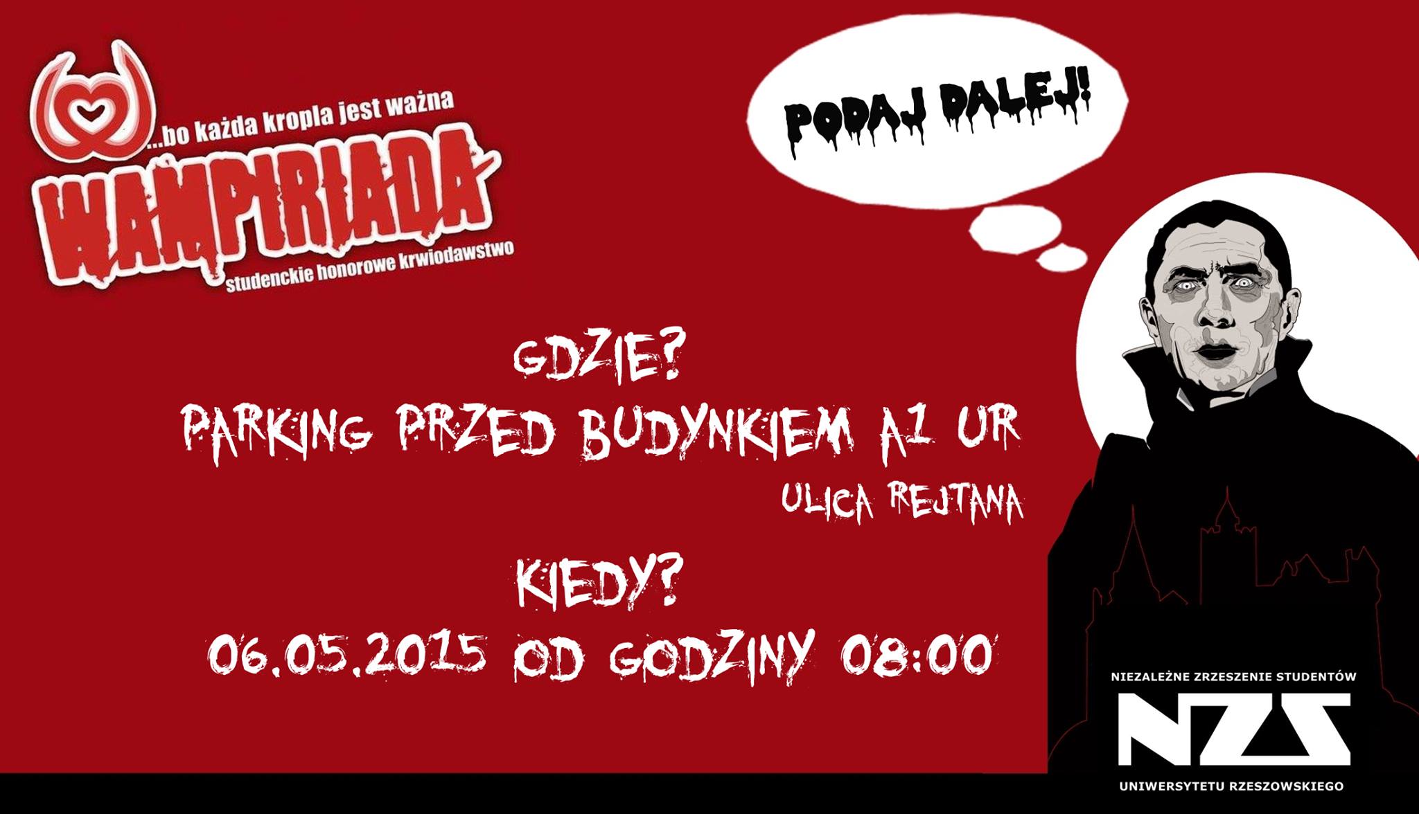 Wampiriada zagości na Uniwersytecie Rzeszowskim 6 maja 2015 roku. Studenci oraz pracownicy uczelni będą mogli oddać krew przed głównym budynkiem UR przy Al. Rejtana od godziny 8.00. Niezależne Zrzeszenie Studentów Uniwersytetu Rzeszowskiego oraz Regionalne Centrum Krwiodawstwa jako organizatorzy akcji, przygotowali dla wszystkich dawców ciekawe upominki.