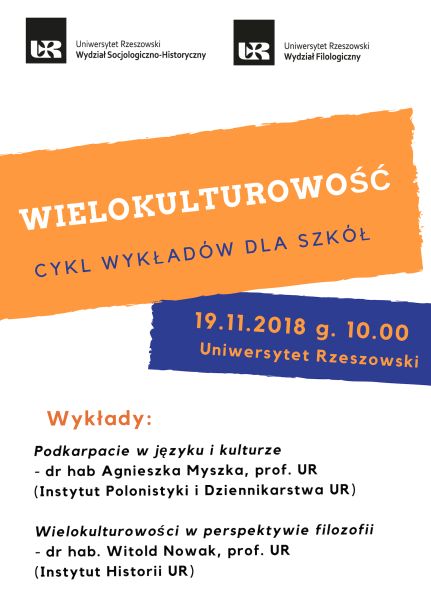 Nawiązując do ubiegłorocznego cyklu wykładów dla podkarpackich szkół ponadgimnazjalnych zatytułowanego „Kobieta”, serdecznie zapraszam do wzięcia udziału w kolejnym cyklu spotkań z zakresu szeroko rozumianej humanistyki (temat przewodni – WIELOKULTUROWOŚĆ), organizowanych przez Instytut Historii oraz Instytut Polonistyki i Dziennikarstwa Uniwersytetu Rzeszowskiego w roku akademickim 2018/2019. Zachęcam również do przekazania informacji o tym unikatowym wydarzeniu Państwa odbiorcom.