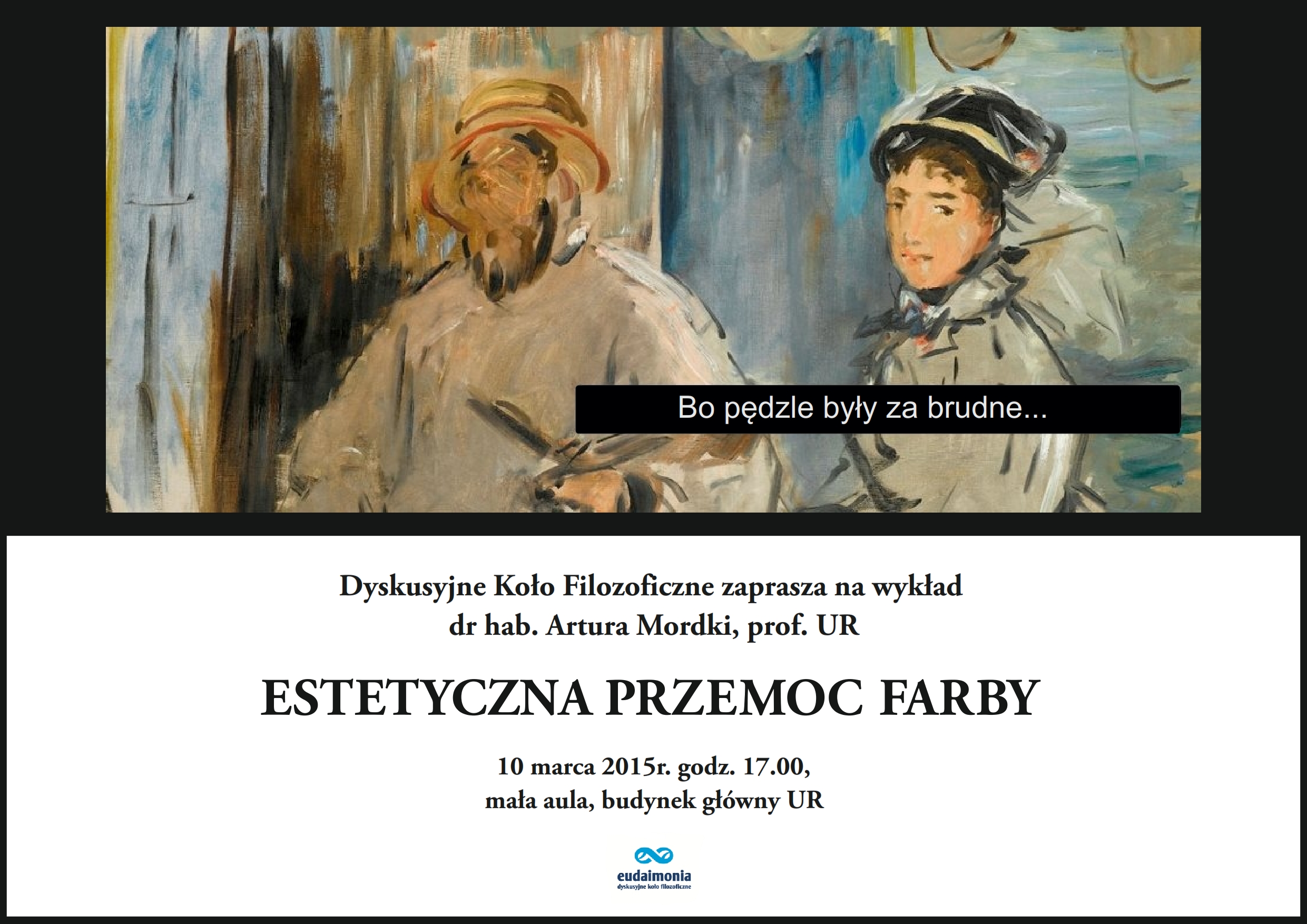 Dyskusyjne Koło Filozoficzne Eudaimonia zaprasza na wykład otwarty pt. „Estetyczna przemoc farby”. Wykład wygłosi dr hab. A. Mordka prof. UR. Wydarzenie odbędzie się 10 marca 2015 o godz. 17.00, w auli im. Stanisława Zająca w budynku głównym UR.
