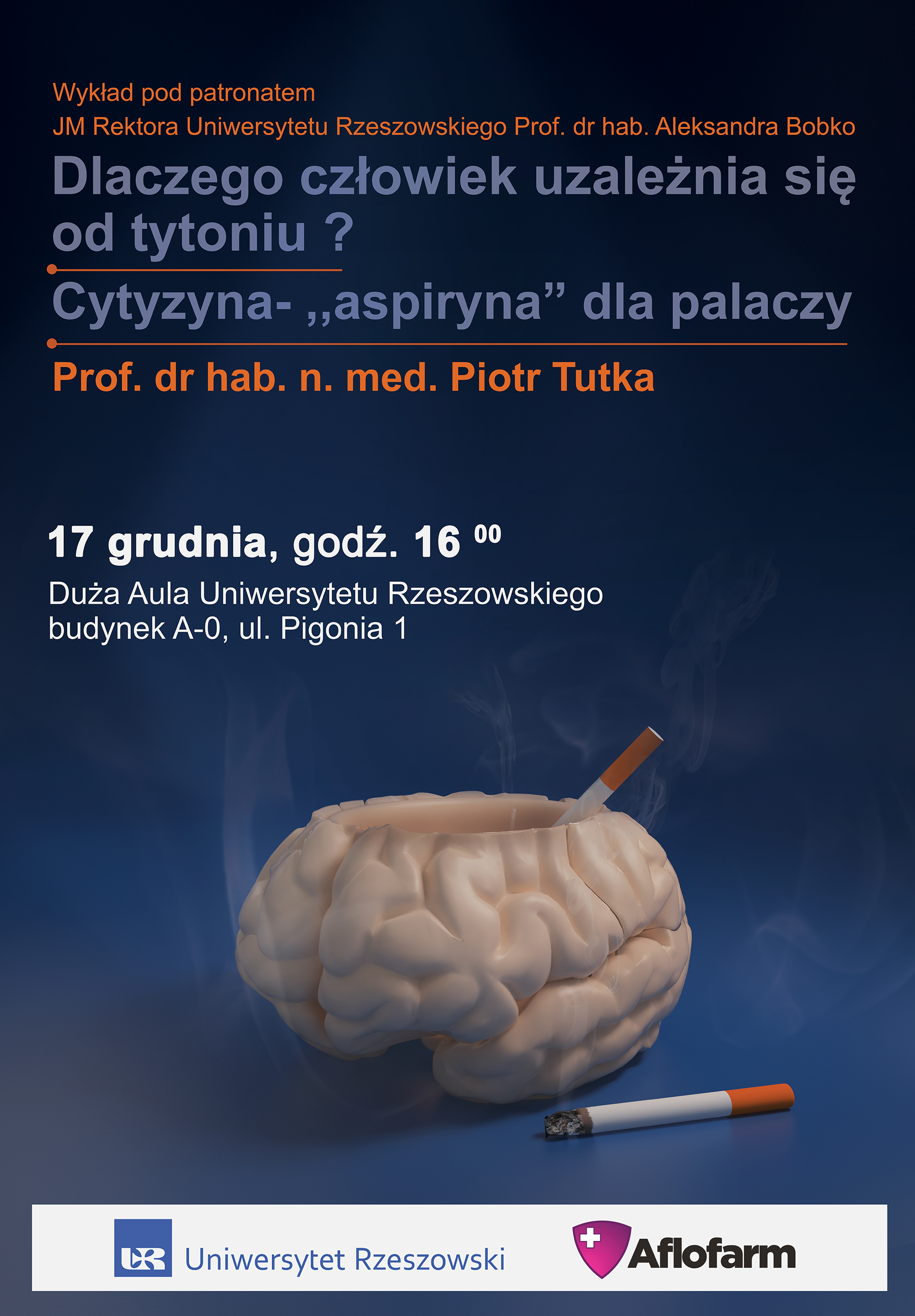 W dniu 17 grudnia (w środę) o godz. 16.00 w Dużej Auli Uniwersytetu Rzeszowskiego, ul Pigonia 1 (budynek A0) odbędzie się wykład otwarty prof. dr hab. med. Piotr Tutki, Kierownika Zakładu Farmakologii Uniwersytetu Rzeszowskiego dotyczący najnowszych osiągnięć medycyny w rozumieniu rozwoju i terapii uzależnienia od tytoniu.