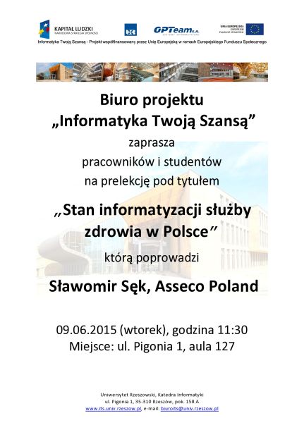 Biuro projektu „Informatyka Twoją Szansą” zaprasza na wykład pana Sławomira Sęka z firmy Asseco Poland pt. "Stan informatyzacji służby zdrowia w Polsce”. Wykład odbędzie się 09.06.2015 (wtorek) o godzinie 11:30 w budynku przy ulicy Pigonia 1 w auli 127.