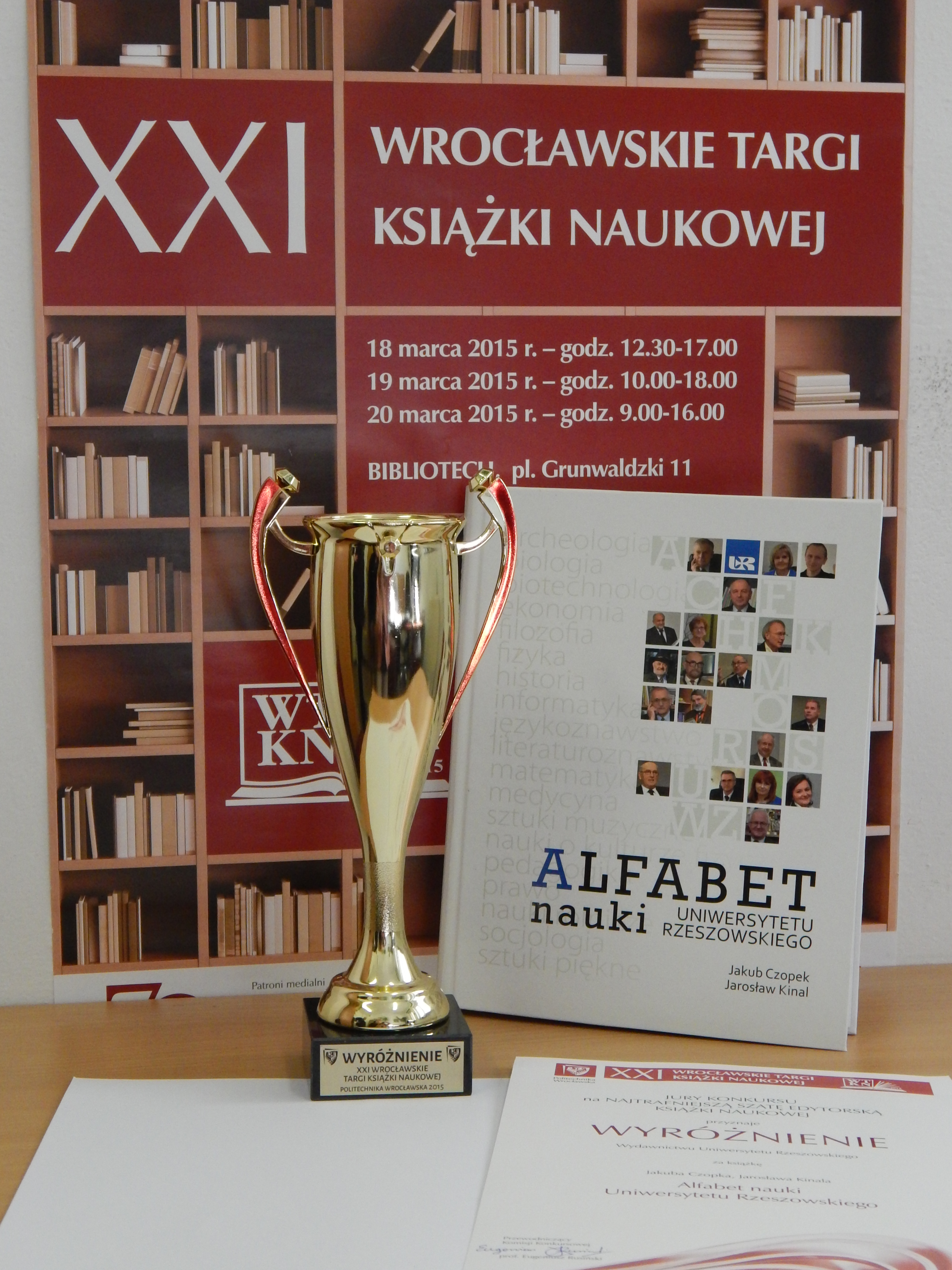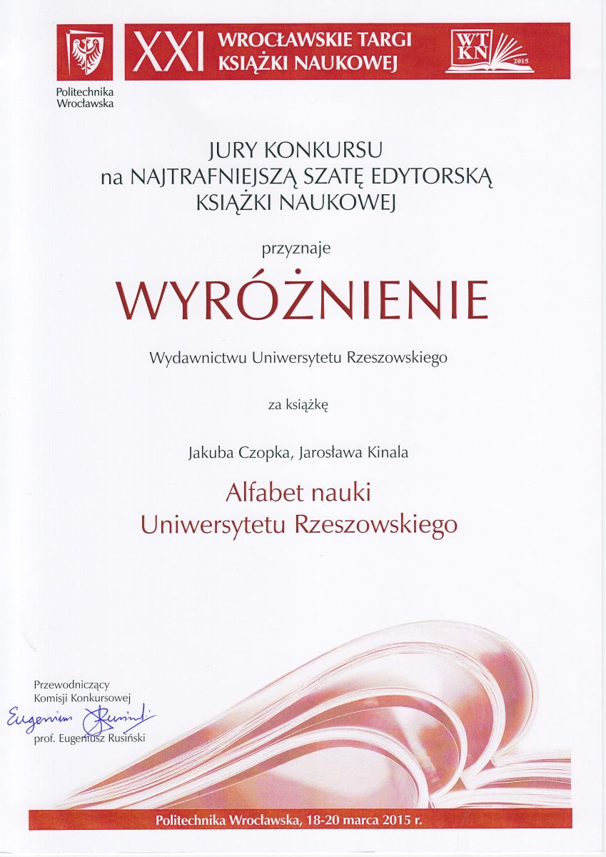 Miło nam poinformować, że Wydawnictwo Uniwersytetu Rzeszowskiego otrzymało wyróżnienie w konkursie na najtrafniejszą szatę edytorską książki naukowej na XXI Wrocławskich Targach Książki Naukowej we Wrocławiu. Kapituła konkursu doceniła publikację Jakuba Czopka i Jarosława Kinala pt. Alfabet nauki Uniwersytetu Rzeszowskiego. Książka jest zbiorem wywiadów z profesorami tytularnymi Uniwersytetu Rzeszowskiego, z których każdy reprezentuje inną dyscyplinę naukową – jest jej ikoną. Celem publikacji jest promocja uniwersyteckiej nauki. Autorzy wybrali formę nietypową, która pozwala na pokazanie, jak nauka wplata się w tkankę losów ludzi, którzy się jej poświęcili, jak je kształtuje, jakie otwiera możliwości, ale też jakie stawia wymagania. O sukcesie naukowym decyduje nie tylko talent, a nawet błysk geniuszu, ale też wytrwała i konsekwentna praca, godziny spędzone w laboratoriach, archiwach, bibliotekach. Publikacja przekonuje, że nauką trzeba żyć, trzeba ją mieć „w sobie”, nie można być tylko jej pracownikiem. Z tego względu staje się też głosem w dyskusji o kondycji nauki w Polsce.
