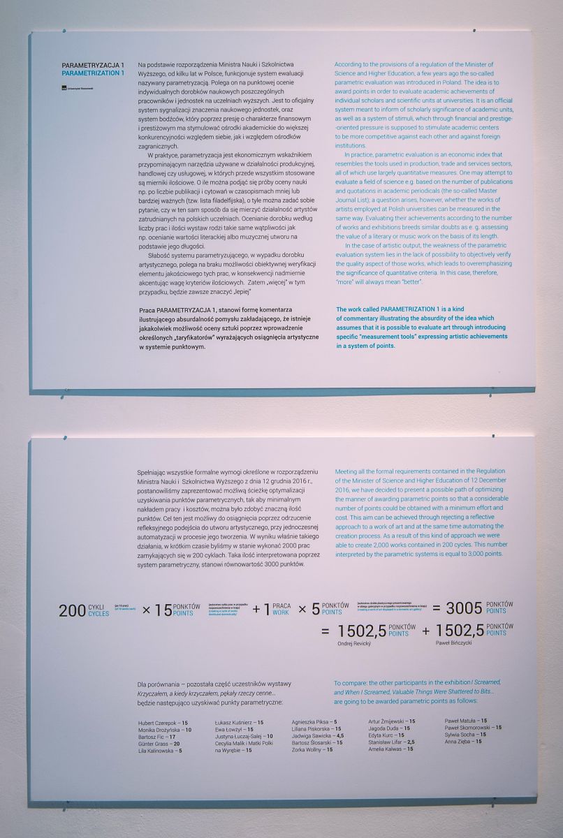 Pierwsza połowa została zaprezentowana na wystawie KRZYCZAŁEM, A KIEDY KRZYCZAŁEM, PĘKAŁY RZECZY CENNE... w Gdańskiej Galerii Güntera Grassa, jako PARAMETRYZACJA 1. Ilość 2000 prac interpretowana poprzez system parametryczny, stanowiła równowartość 3000 punktów.
