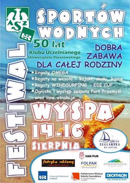 Zapraszamy serdecznie wszystkich do udziału w tegorocznym, XIII już Memoriale Edwarda Sądeckiego - Edi Cup wraz XI Festiwalem Sportów Wodnych, organizowanym na terenie Bazy Żeglarskiej KU AZS UR na Wyspie w Polańczyku. Jak co roku rozegrane zostaną wyścigi windsurfingowe, regaty omeg, mecz piłki wodnej, dodatkowo program został rozszerzony o nowe atrakcje i konkurencje. Część z nich pozostanie tajemnicą do samej imprezy - małe niespodzianki i efekty zaskoczenia też są potrzebne. W sobotę zapewniamy wieczór przy ognisku z muzyką znanego nam doskonale zespołu Port Przemyśl.