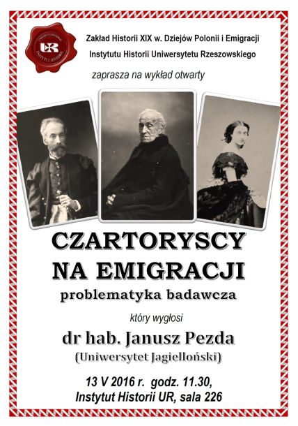 Zakład Historii XIX w. Dziejów Polonii i Emigracji Instytutu Historii Uniwersytetu Rzeszowskiego zaprasza na wykład otwarty "Czartoryscy na emigracji — problematyka badawcza"