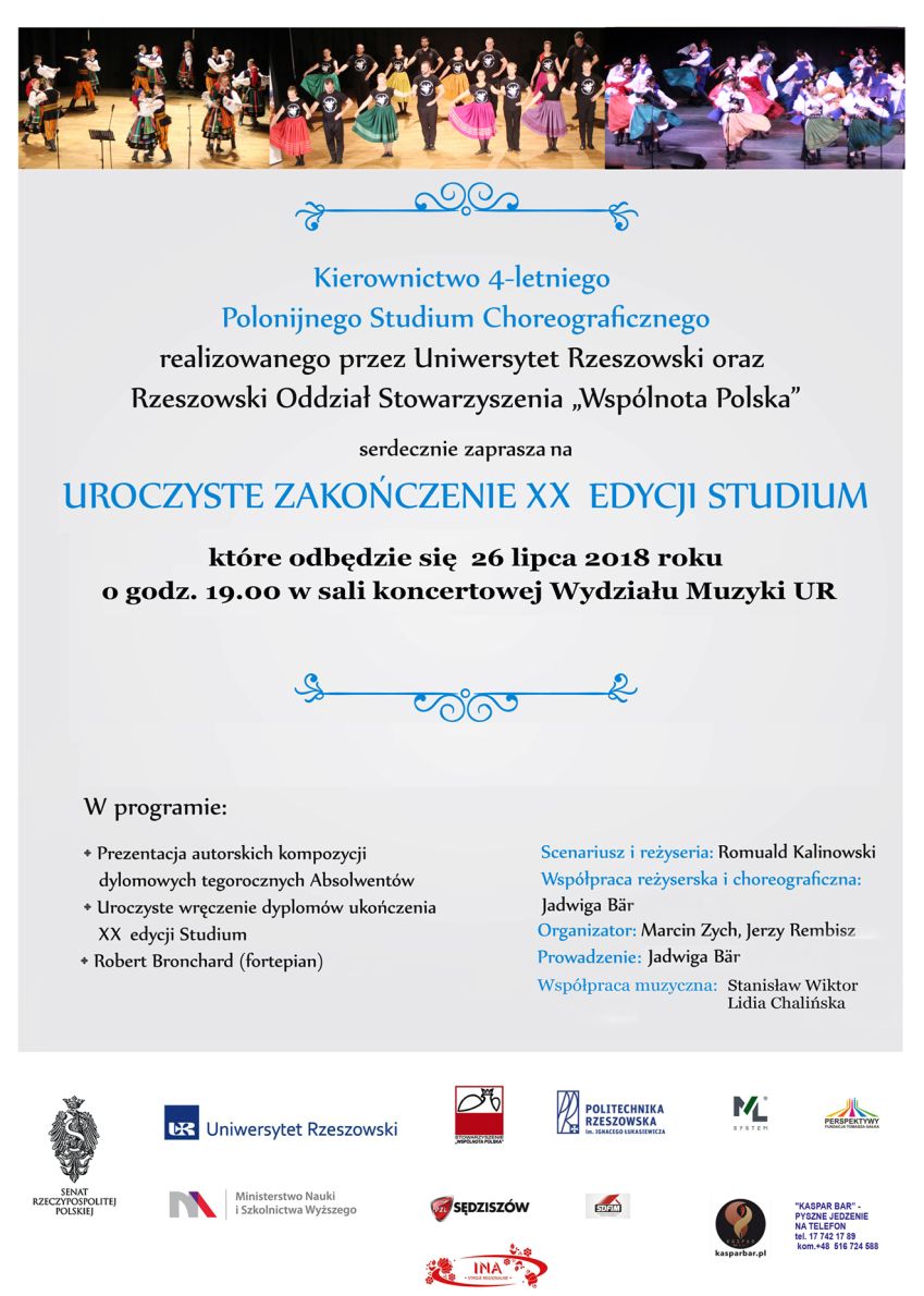 26 lipca 2018 r. na Wydziale Muzyki Uniwersytetu Rzeszowskiego odbyło się uroczyste zakończenie XX Jubileuszowej edycji czteroletniego polonijnego studium choreograficznego.